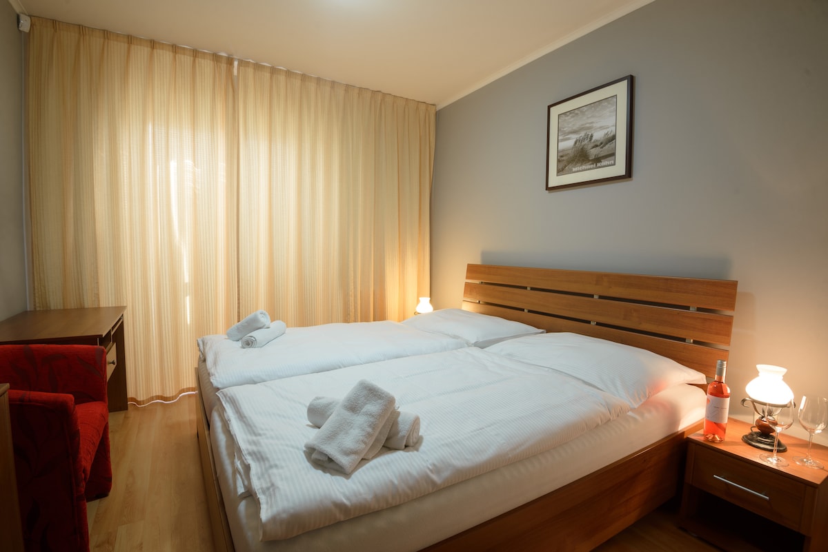 Respirez en famille après une journée bien remplie dans notre ENSEMBLE d'appartements familiaux. C'est une suite élégante et agréable de deux pièces, où vous trouverez un grand lit avec couvertures agrandies, petite kitchenette séparée, table d'échecs, minibar, TV, lecteur DVD et possibilité de se reposer sur une belle terrasse de la chambre. La chambre n ° 2 dispose de 2 lits simples séparés, de sorte que cet appartement peut accueillir jusqu'à 4 personnes.