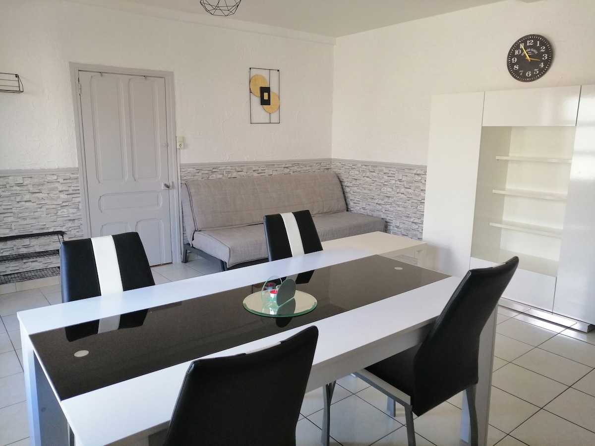 Appartement au rez de chaussé avec entrée privé. - 1 chambre avec lit double, 1 salon avec clic clac, table avec 4 chaises, 1 cuisine équipé et salle de bain avec douche et WC. Lit bébé disponible sur demande. Une petite cour extérieur non fermer avec parking pour la voiture juste devant. A coté du logement vous trouverez une boulangerie, restaurant.. A votre disposition, café, thé, confitures..