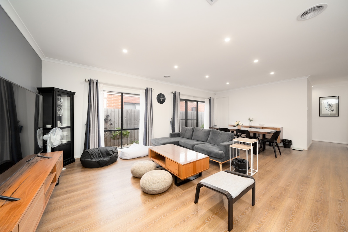 Détendez-vous dans cet espace calme et élégant. Bienvenue dans notre maison confortable de trois chambres située à Tarneit, Victoria. Notre logement est parfait pour les groupes d'adultes et les voyageurs d'affaires, si vous êtes à la recherche d'un logement confortable et élégant. Non adapté aux enfants de moins de 12 ans, y compris les bébés. Restez à l'aise toute l'année avec chauffage central et refroidissement par évaporation.