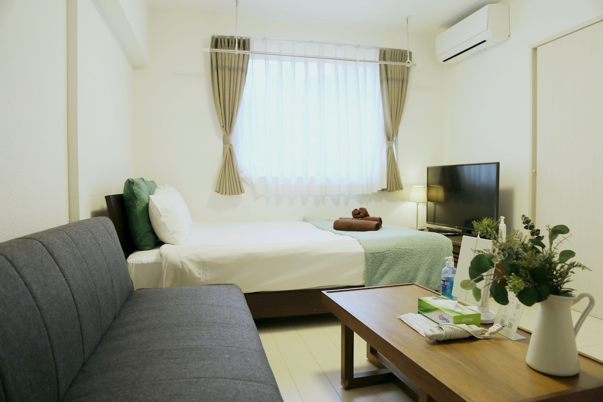 Ce logement est idéal pour profiter d'un séjour de moyenne à longue durée en famille ou entre amis. Il s'agit d'un hôtel d'appartements ouvert en 2023 situé dans un quartier résidentiel calme proche du centre-ville. Il y a des rives, des parcs et des sanctuaires à proximité. L'intérieur spacieux de 35 ㎡ est conçu dans un style japonais. Il y a 1 lit queen size, 3 futons et peut accueillir jusqu'à 5 adultes. (Les enfants de moins de 2 ans peuvent dormir gratuitement.) Il y a une cuisine compacte, une machine à laver et à sécher entièrement automatique, une salle de bain spacieuse et des toilettes séparées. Il y a aussi une télévision Android et une connexion Wi-Fi gratuite, ce qui en fait un environnement suffisant pour passer du temps à l'intérieur ou travailler. Vous pourrez également vous détendre sur le toit ouvert aux clients. L'enregistrement s'effectue via un système d'enregistrement automatique utilisant une tablette, donc il n'y a pas de soucis, même tard dans la nuit. La porte est gérée par le dernier système de clé tactile. Il est situé à 5 minutes à pied de la sortie de la gare la plus proche (Sumiyoshi Station, Hankyu Line, Toei Shinjuku Line) et il y a un supermarché à proximité. Détendez-vous avec votre famille dans cet hébergement calme.
