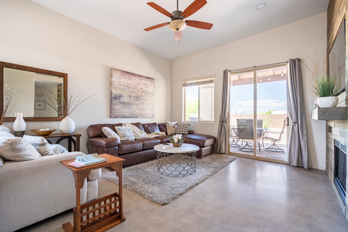 Retraite spacieuse 4BR/2,5BA à Tucson avec piscine privée et vue imprenable sur la montagne. Parfait pour les familles, les groupes ou les professionnels qui déménagent. Profitez d'une baignade rafraîchissante, d'un grand espace pour se détendre et d'un accès facile au parc national de Saguaro West, aux studios Old Tucson et plus encore. Le jacuzzi non chauffé est idéal pour les soirées fraîches. Réservez votre escapade dans le désert dès aujourd'hui !