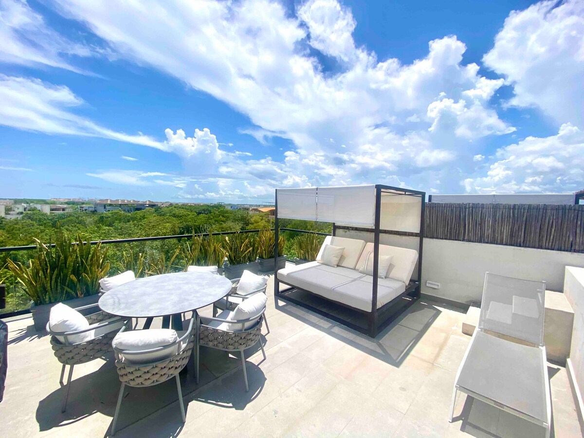 Jacuzzi privé, 2 balcons privés, piscine privée, terrasse privée sur le toit. Profitez des couchers et des levers de soleil et bronzez-vous. Excellent sommeil sur un surmatelas en mousse à mémoire de forme pour lit king size. Cuisine complète. Option de location de trottinette. Piscine et spa communautaires. 1 500 pieds carrés d'espace de vie. 150 m². Avec 1500 pieds carrés supplémentaires de terrasse privée. Faites un barbecue au bord de la piscine en regardant le coucher du soleil. 7 min en scouteur de la plage - 15 min en vélo. Marchez jusqu'à la route principale de Tulum en 5 minutes. Sécurité 24h/24, stationnement gratuit.