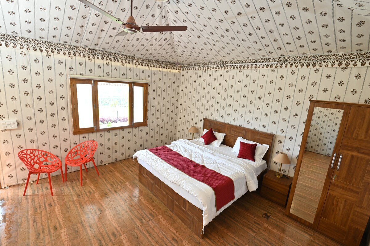 Ce luxueux chalet de suite (l'un des 2 cottages de la propriété) offre la vue la plus directe sur le lac Mulshi est construit à partir de boue naturelle et de pierre de latérite. Le lac mulshi est visible à travers la grande fenêtre en verre directement en face du lit en bois vintage. Le chalet est situé loin de nos espaces communs à 2 à 3 minutes à pied et comprend des marches de navigation le long d'une pente. Notre propriété est répartie sur 2 acres de verdure, d'arbres indigènes, de vergers et de fermes dans le Sahyadris entre Mumbai et Pune.