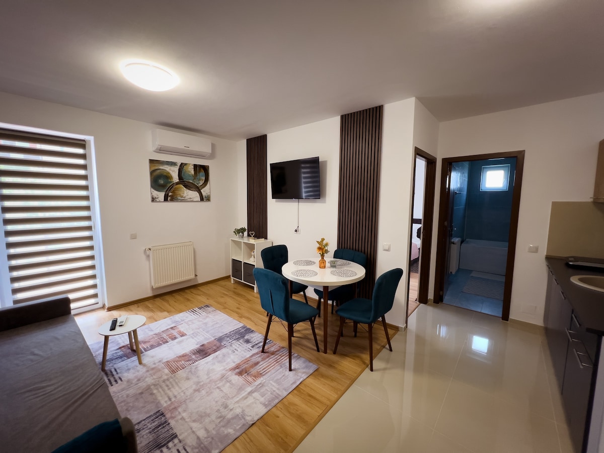 Appartement de 2 pièces, moderne et accueillant, idéal pour les couples ou les voyageurs en solo. Chambre avec lit queen size, salon ouvert avec télévision, cuisine pratique et salle de bain propre. WiFi rapide, climatisation et arrivée flexible. 🐾 Animaux acceptés : les animaux de compagnie sont les bienvenus. Mine de sel de Turda à 10 min à pied. Magasins et gare routière à proximité du logement.