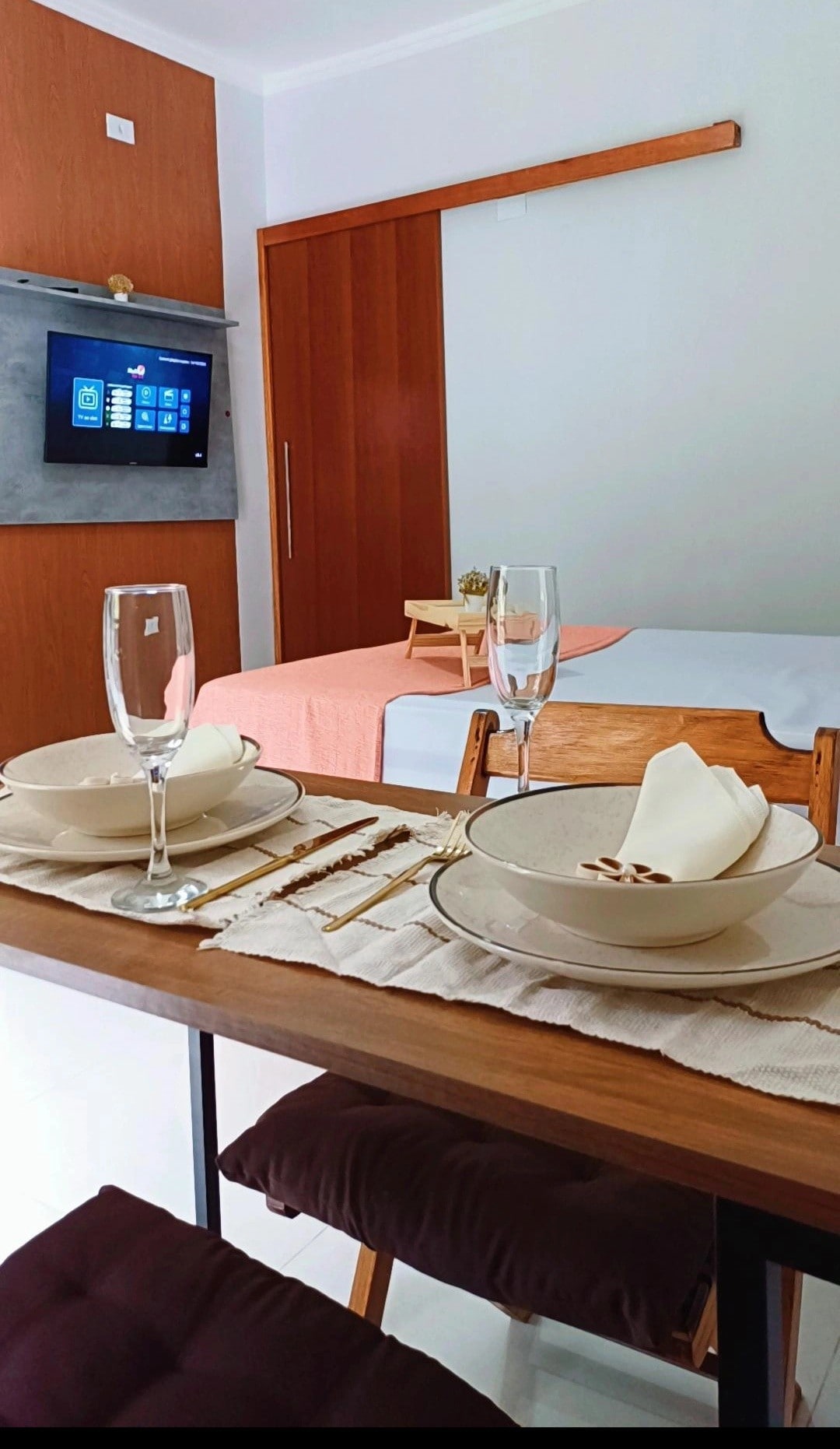 Apartamento tipo estúdio, perfeito para curtir e pra quem está de home offic.Estúdio tem uma smart TV conectada ao wifi 43" INTERNETE FIBRA com suporte de teto giratório (para visualizar tanto da cama/quarto, quanto da varanda gourmet.A cozinha está equipada com principais ELETRODOMÉSTICOS (fogão e forno à gás, geladeira,microondas liquidificador, sanduicheira, etc) e UTENSÍLIOS (pratos, talheres, panelas, assadeiras, panela de pressão, copos ETC WiFi Fibra Óptica alta velocidade 300megas.