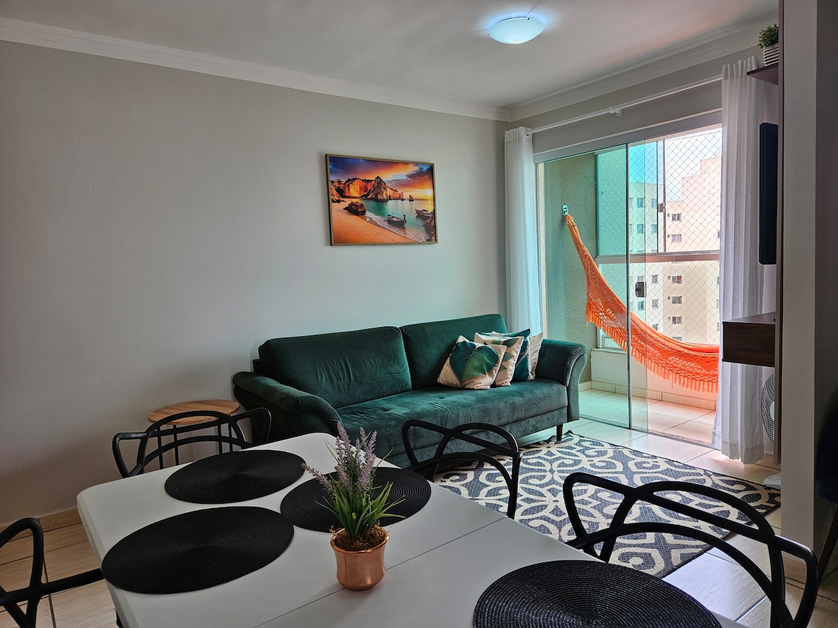 Apartamento de 2 Quartos Quarto suite: Cama de casal grande com TV, armário e ar Condicionado! Quarto 2 cama de solteiro com auxiliar, TV e Armario(Roupas de camas e toalhas)!Sala de estar: 1 sofá-cama TV, Mesa de jantar, Ar condicionado e varanda com adega e frigobar! Cozinha Geladeira, fogão 4 , micro-ondas, airfryer, sanduicheira, forno! Lavanderia com lava e seca Varal, Ferro e mesa de passar! Prédio com elevador, condomínio com piscina, academia, mercadinho, espaço Kids! PORTARIA 24HRS!