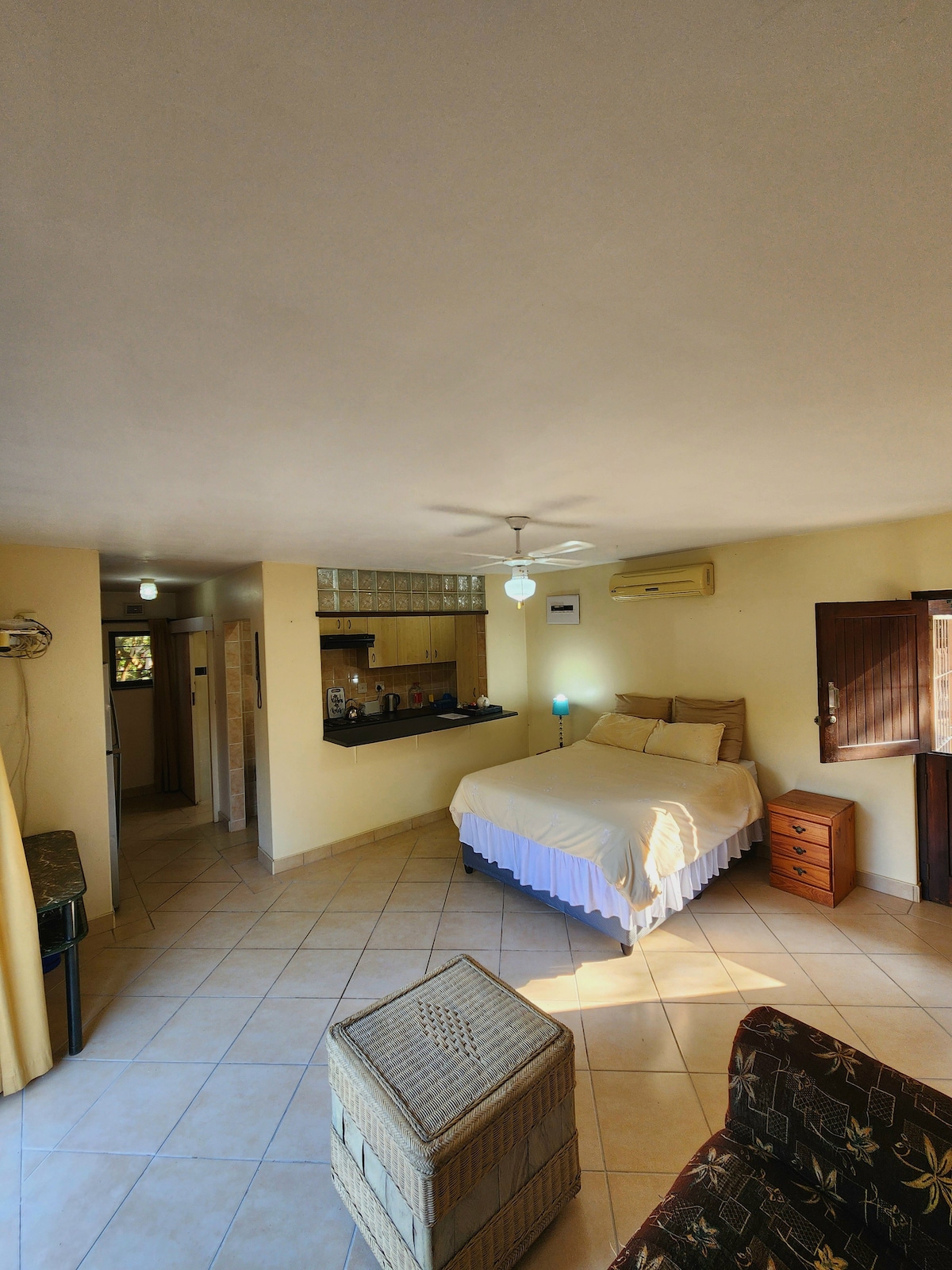 Chalet sous notre maison avec une petite cuisine, une chambre et une salle de bain. Il s'agit d'un logement indépendant avec réfrigérateur bar, four à micro-ondes et cuisinière à 2 plaques avec four et couverts et ustensiles de cuisine. Nous avons 2 petits chiens, un Yorkie et un Jack Russell. Il y a un barbecue et une grande piscine. Télévision et wifi disponibles. La maison est entourée d'un beau jardin tropical et est calme et paisible. Nous sommes à environ 1 000 mètres de la plage la plus proche. Parking ouvert disponible. Bébés et enfants autorisés.