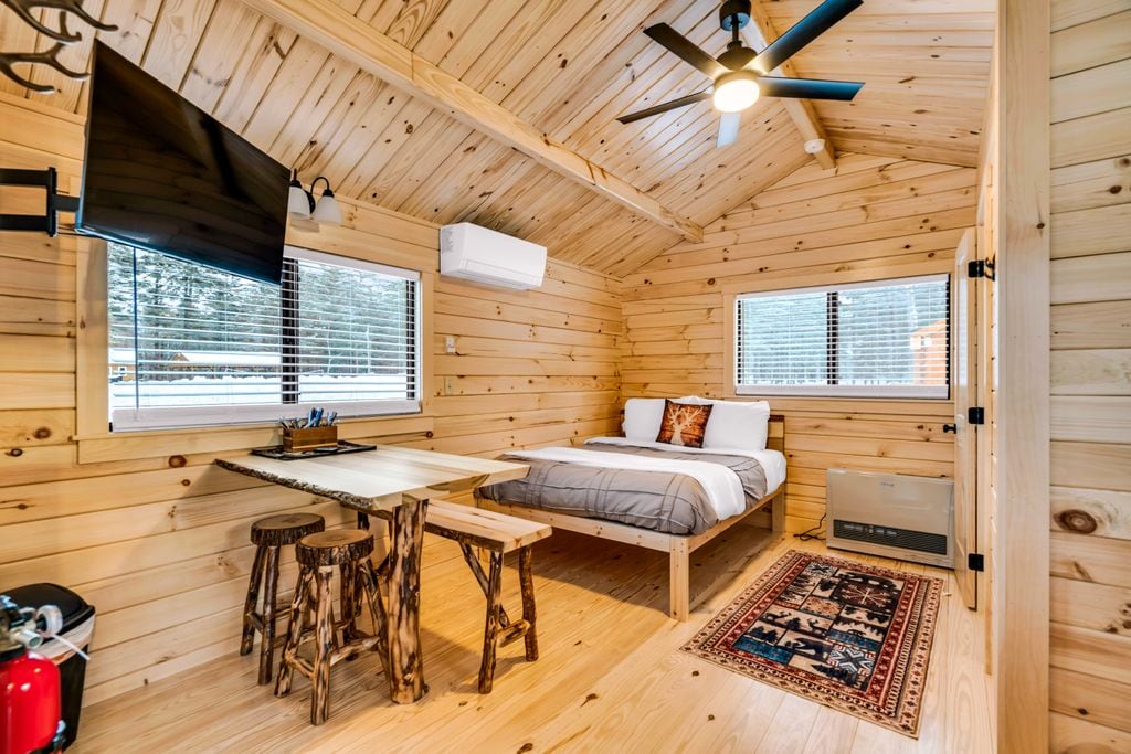 Cabane d'une pièce avec tout le nécessaire. À l'entrée initiale, vous êtes dans le porche grillagé. Cela vous permet d'avoir votre bois de chauffage à proximité, de nombreuses chaises confortables pour vous prélasser et de vous éloigner des insectes estivaux. La porte du camp est verrouillée avec une serrure à code. À l'entrée du camp, vous serez accueilli dans une maison accueillante. Les seules choses dont vous aurez besoin sont de l'eau potable et des sacs de couchage. Les lits superposés sont équipés de draps propres. Venez profiter de la vie au camp !