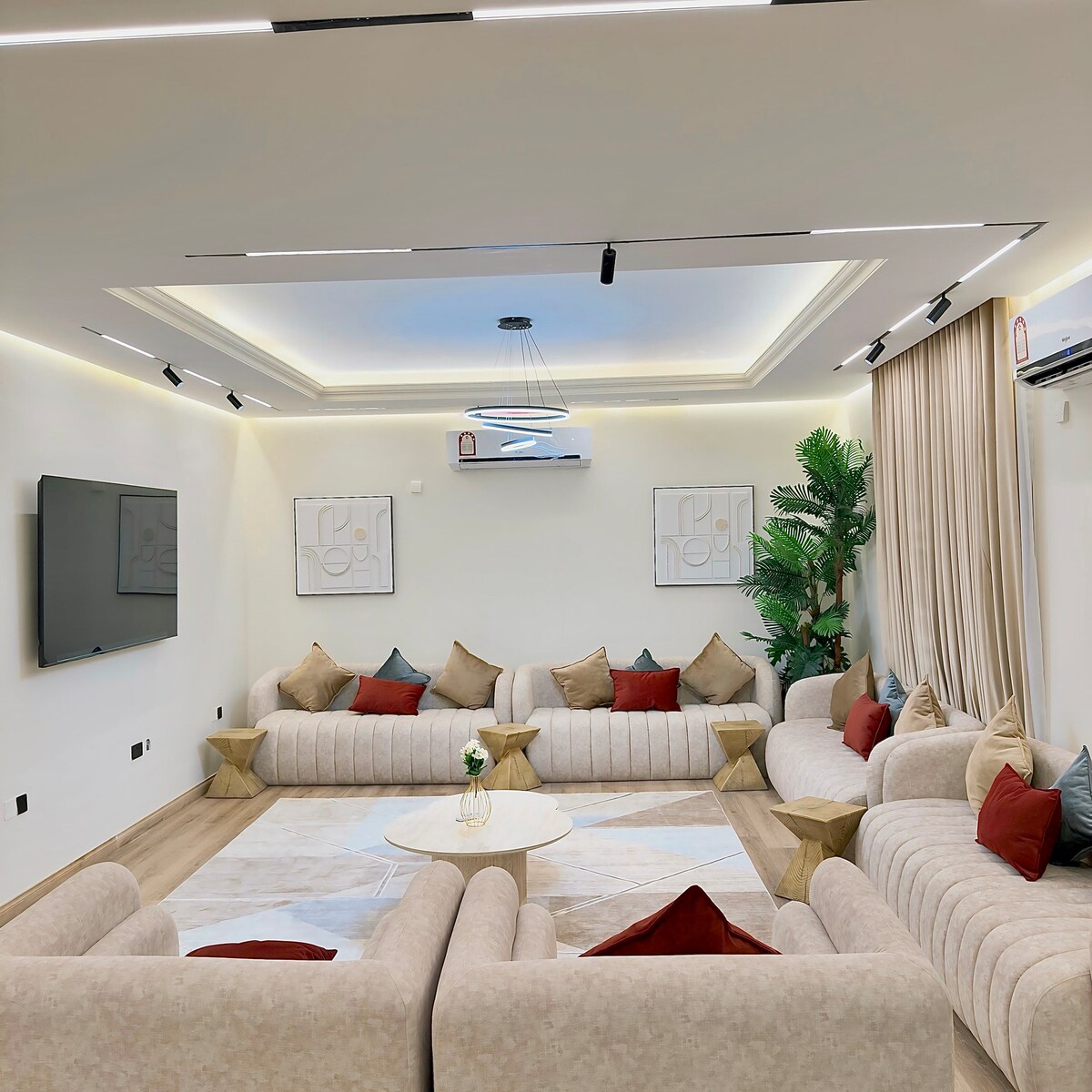 Cette villa est parfaite pour passer du temps en famille et avec des amis proches. C’est calme et loin de la ville, donc vous pouvez vous détendre et profiter de votre temps ensemble. Elle compte cinq chambres avec des lits queen et king, une salle de jeux pour enfants, une table de billard et un baby-foot, ainsi que deux piscines intérieures chauffées pour adultes et pour enfants. À l’extérieur, vous trouverez un espace barbecue, une petite aire de jeux et un majlis privé pour vous détendre, boire du thé et vous relaxer.
