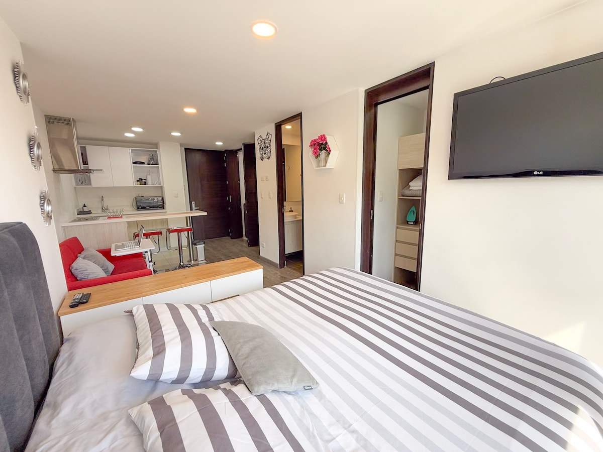 Luxueux une chambre dans le quartier le plus exclusif / sûr de Bogota (Chico) à distance de marche des meilleurs restaurants, centres commerciaux et à proximité de nombreuses entreprises. Logement de niveau exécutif avec espace de travail dédié, terrasse privée, cheminée automatique, wifi fiable, parking privé et sécurité de l'immeuble. Ameneties : Profitez de la belle terrasse panoramique avec foyer et barbecue extérieur. Jouez également au squash et détendez-vous dans le sauna ou le hammam.