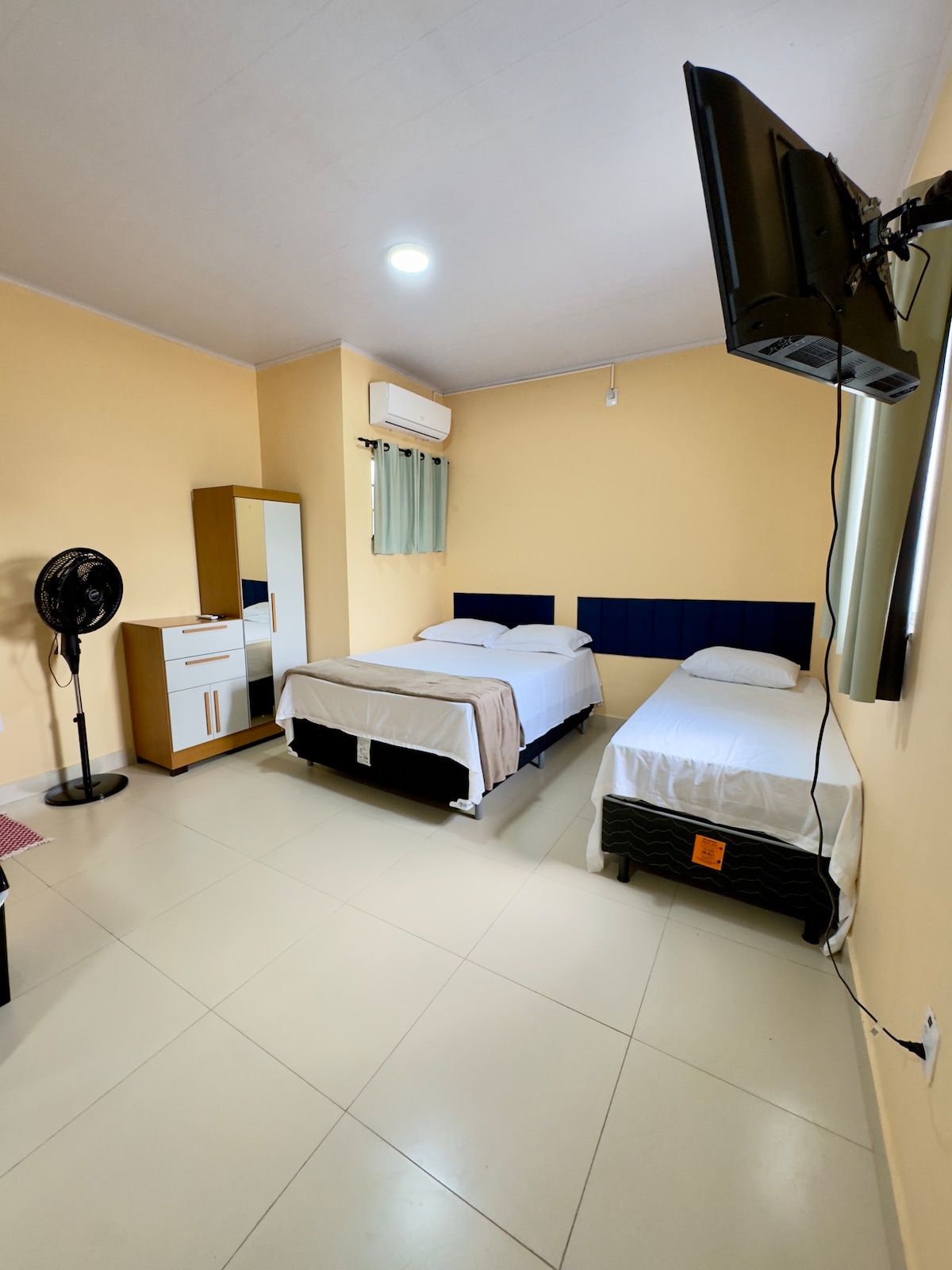 Sentez-vous comme chez vous dans cet appartement du quartier de Marco. Étage élevé, balcon, moustiquaire. Idéal pour vous détendre en famille, s'il fait chaud profitez de la piscine. Suite : lit double, télévision sans accès à Internet, climatisation, douche électrique, placard. Salon : Lavabo, canapé-lit, table, climatisation. Cuisine : réfrigérateur, cuisinière, micro-ondes, cafetière. Zone de service : Machine à laver et réservoir. Wi-fi et 1 place de parking. Proche de Bosque Rodrigues Alves, Hangar C. de Conv. da Amazônia, hôpitaux, restaurants, pharmacies