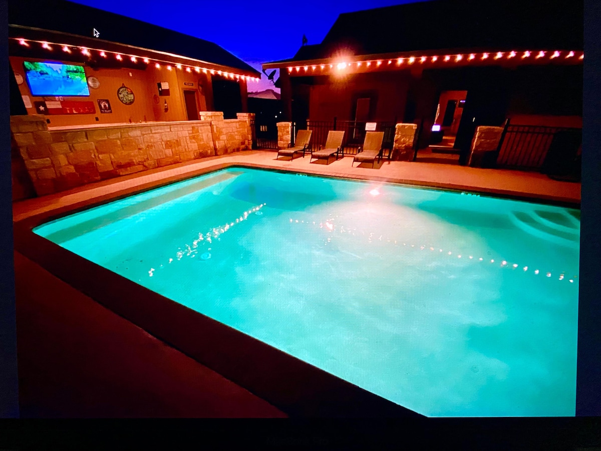 Détendez-vous dans notre maison paisible et spacieuse, située en plein cœur d'Uvalde. Détendez-vous avec notre télévision grand écran dans notre maison en briques de 4 chambres. Profitez de notre patio arrière confortable ou échappez à la chaleur dans notre mini salle de jeu. Notre maison est complète avec une cuisine bien équipée ainsi qu'un bar à café confortable. N'oubliez pas de vous amuser sur la grille pour vos aventures culinaires en plein air et de profiter du brasero pour cuisiner des smores avec votre famille !