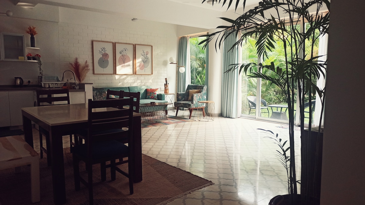 Voici Pamela Palms™ - avec de grands palmiers verts et des vues rares sur les arbres, cet appartement lumineux et moderne de 67 m² avec 2 chambres au 3e étage est à 5 minutes en voiture de la plage d'Anjuna, et est plein de lumière naturelle et de Goa! Équipé d'un Wifi ultra rapide (300 Mbit/s) et d'une alimentation de secours, vous serez étroitement connecté aux restaurants les plus cool, aux restaurants chics et aux supermarchés. Un séjour animé pour vos escapades à Goa et vos vacances-travail avec votre groupe!