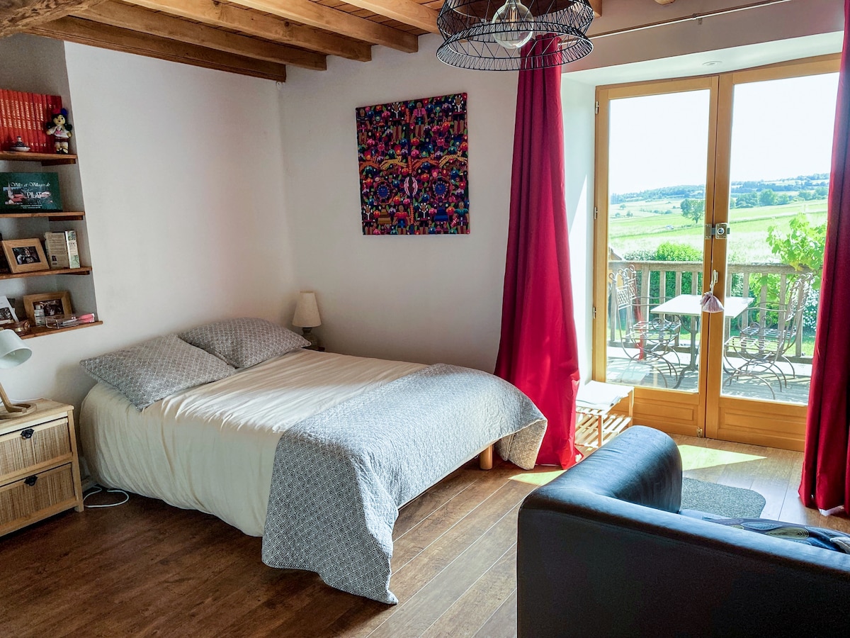 Nous vous accueillerons au cœur d’un village des Pierres dorées du Beaujolais, dans un cadre exceptionnel, en pleine campagne, propice aux balades, à la détente, au repos... Dans une grande batisse en pierres dorées entièrement rénovée, vous profiterez d'une chambre spacieuse au rez-de-chaussée avec une salle de bain et wc attenants. Notre désir est de vous faire passer un très agréable séjour au calme dans notre chambre d'hôtes décorée avec goût.