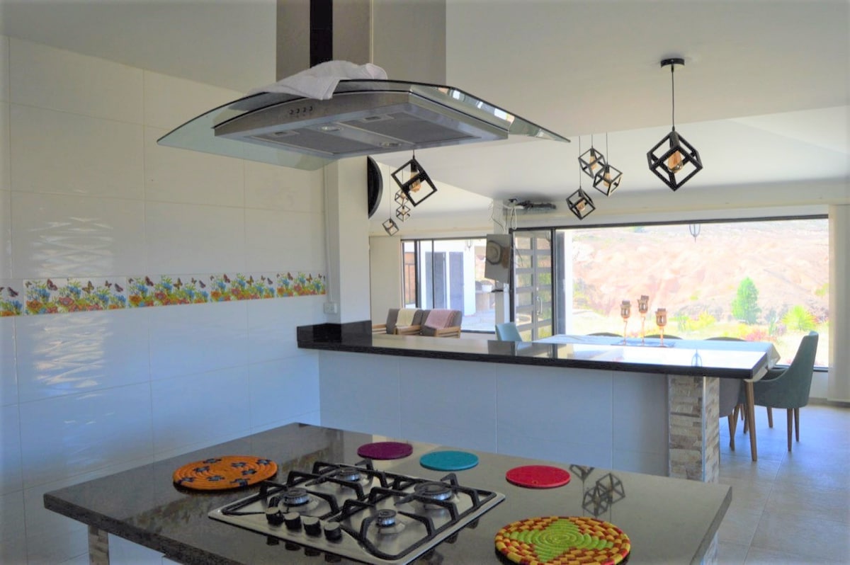Casa del Viento combine une architecture régionale et un design contemporain pour offrir un séjour confortable et authentique. La cuisine ouverte invite à partager des moments en groupe, et la terrasse avec vue sur les montagnes et le barbecue créent l'atmosphère parfaite pour se détendre et profiter d'un superbe coucher de soleil. Elle est située dans une zone rurale calme, mais à seulement 2,5 km du centre de Villa de Leyva. Tous les espaces sont conçus pour vous permettre de vous reposer avec style. Écrivez-moi pour réserver.