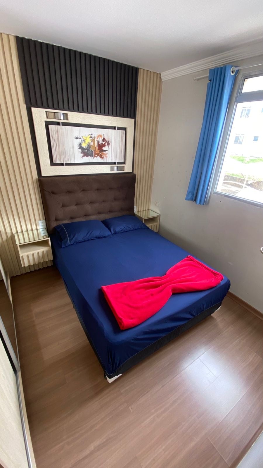 Appartement meublé avec 2 chambres et 3 lits (1 complet et 2 lits jumeaux). Cuisine complète avec micro-ondes, cafetière, machine à sandwich, ustensiles, réfrigérateur et cuisinière. Télévision, Wi-Fi et ventilateur au plafond. Appartement en résidence avec place de parking, aire de jeux, espace barbecue, mini-marché et concierge 24h/24. Situé près de l'aéroport de Confins, de la Cidade Administrativa, de la Cidade do Galo et du shopping. Région calme, sûre et facile d'accès.