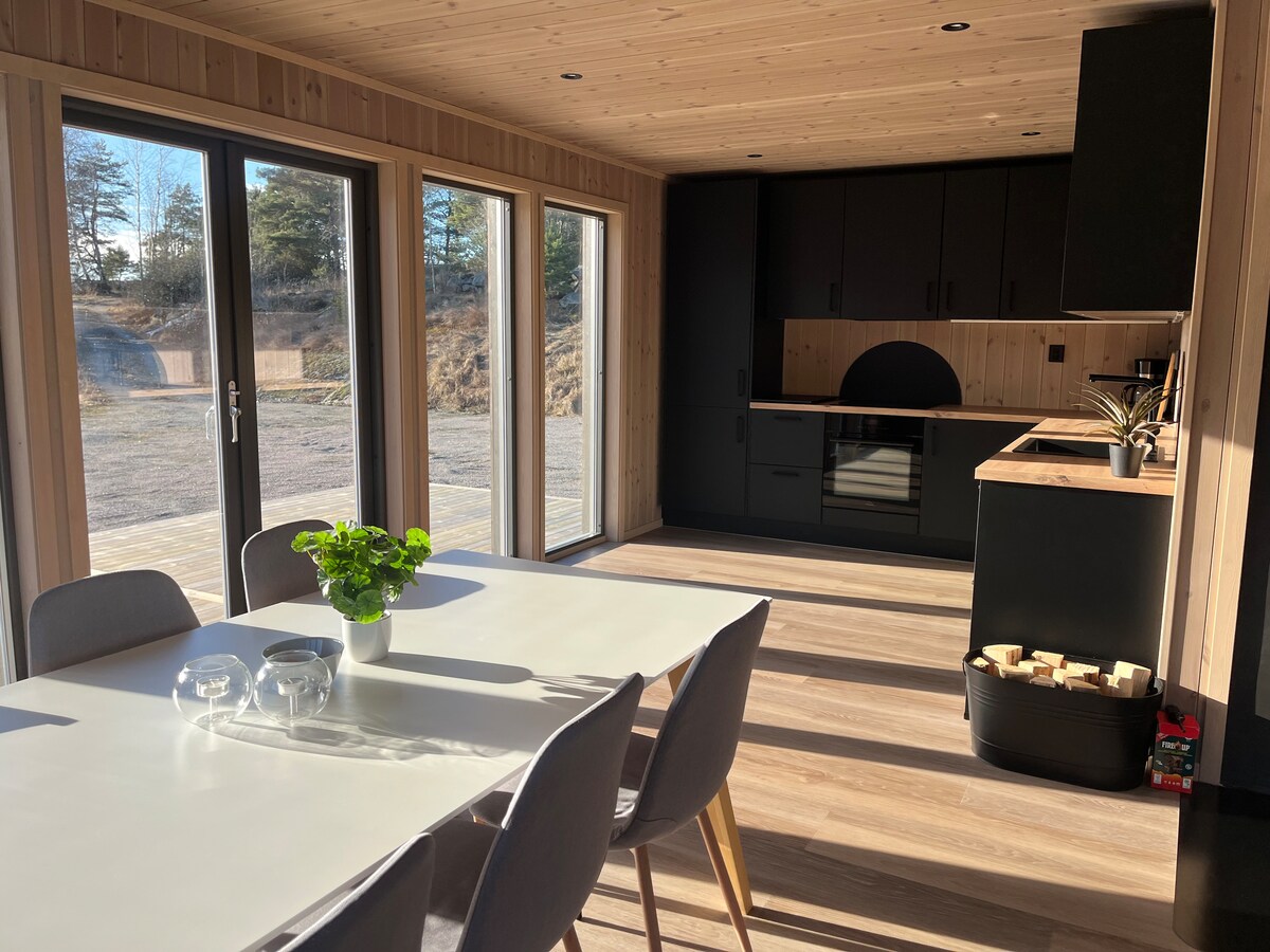 Cabane moderne avec vue panoramique sur la mer Vue panoramique imprenable et grande intimité, surplombant l'Oslofjord. Cette cabane moderne dispose de terrasses spacieuses ensoleillées du matin au soir. Bain chauffé (mai-septembre) Des espaces de vie lumineux et ouverts. Plage : 4 minutes à pied de la plage familiale. Nature : sentiers côtiers pittoresques à proximité. Vie urbaine : à 15 minutes en voiture de la vieille ville historique de Fredrikstad. À 1 h 30 en voiture d'Oslo.