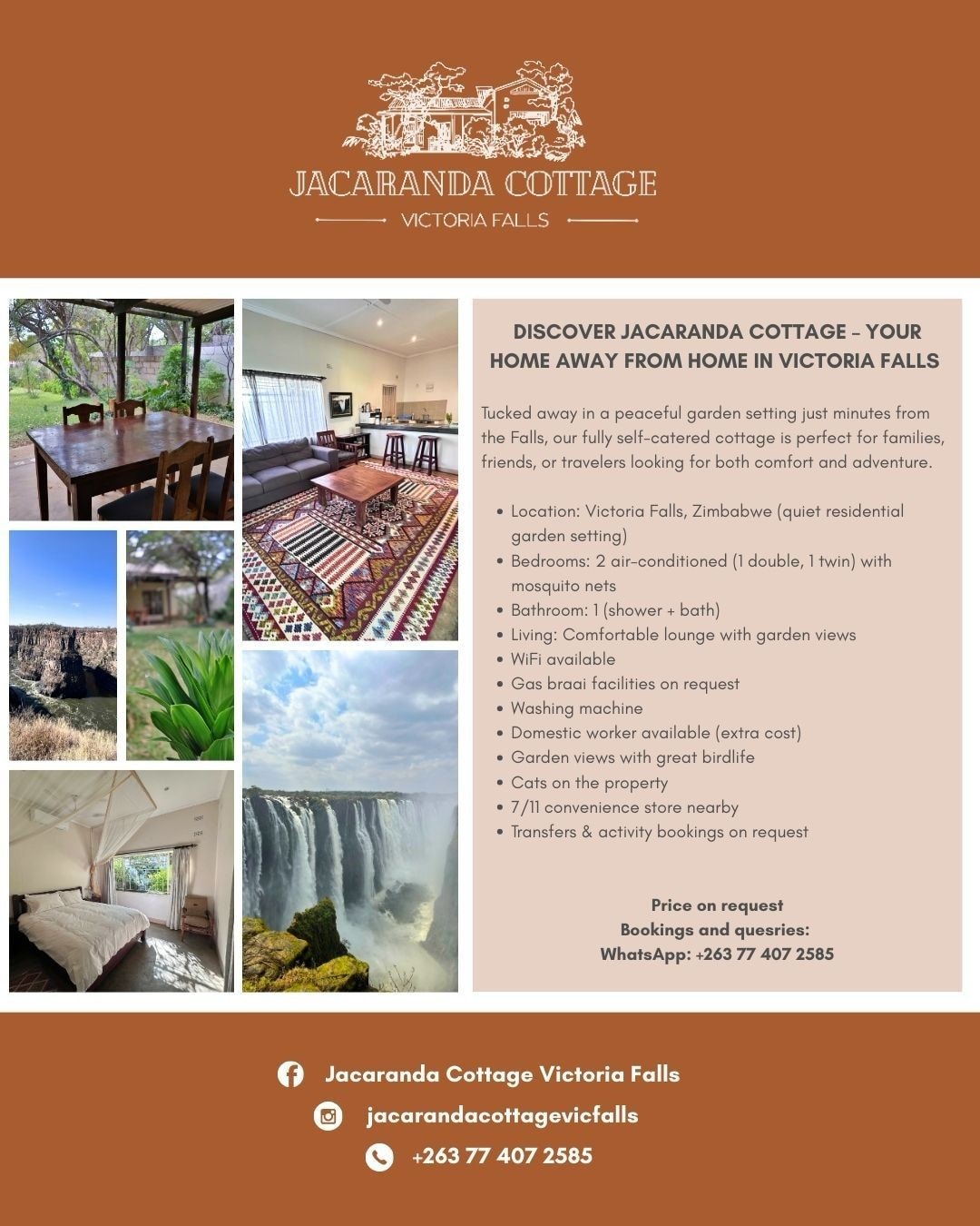 This newly built home, set in a secure private tranquil complex in the serene city of Victoria Falls National Park, is designed with Airbnb guests in mind. It features a fully equipped self-catering kitchen, two spacious en-suite bedrooms with queen beds, and a private garden ideal for relaxation. Enjoy the small swimming pool to cool you down in the hot summer months. Shady indigenous trees provide protection from the hot sun, and the chance to observe over 30 bird species unique to the region.