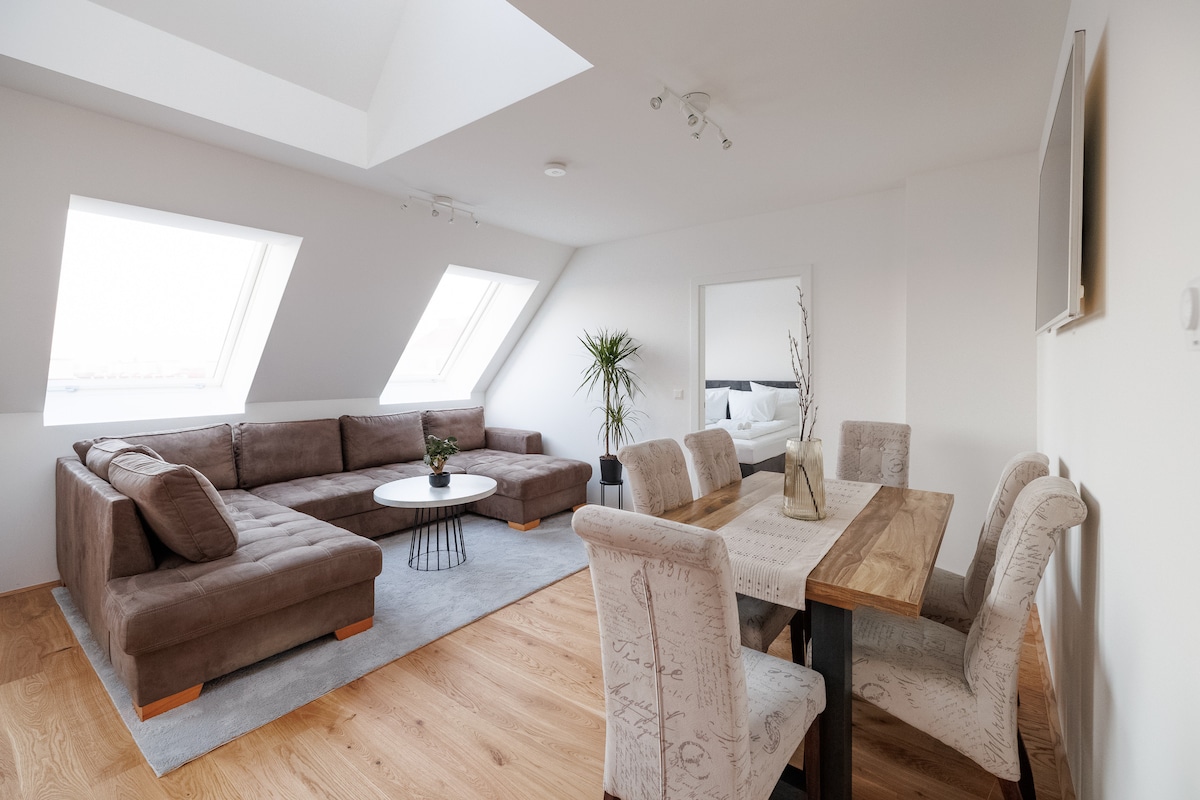 Loft avec 115 m² et terrasse de 30 m² près de l'un des plus grands quartiers commerçants de Vienne, la Mariahhilfer Strasse, à 2 min de la station de métro U3 et à proximité de la gare Westbahnhof. Vous adorerez le penthouse pour sa belle vue sur les toits de Vienne, son appartement spacieux et son mobilier de luxe. Ce loft est parfait pour les groupes et les familles (avec enfants), mais aussi pour les couples. Nous accueillons tout le monde, soyez seulement gentil et pas bruyant.