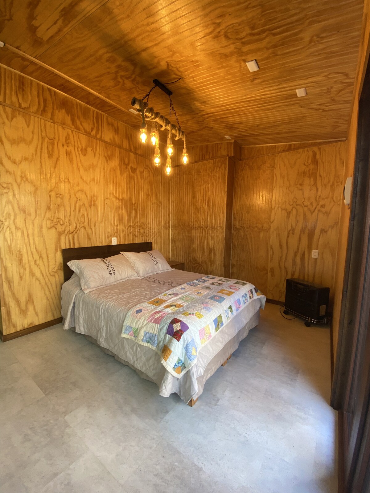 Belle cabane -Martin Pescador- en bois de 55 m² avec 2 chambres, une avec un lit double de 2 places et une autre avec un lit d'une place et demie plus un lit gigogne d'une place. Chauffage avec radiateur électrique et chauffage supplémentaire à granulés central. Grande salle de bain avec lave-linge inclus. Cuisine équipée et réfrigérateur. Excellente construction avec isolation thermique, plancher en bois et toutes les fenêtres en panneau thermique. Possibilité d'un excellent petit déjeuner pour 7 500 pesos chiliens p/p.