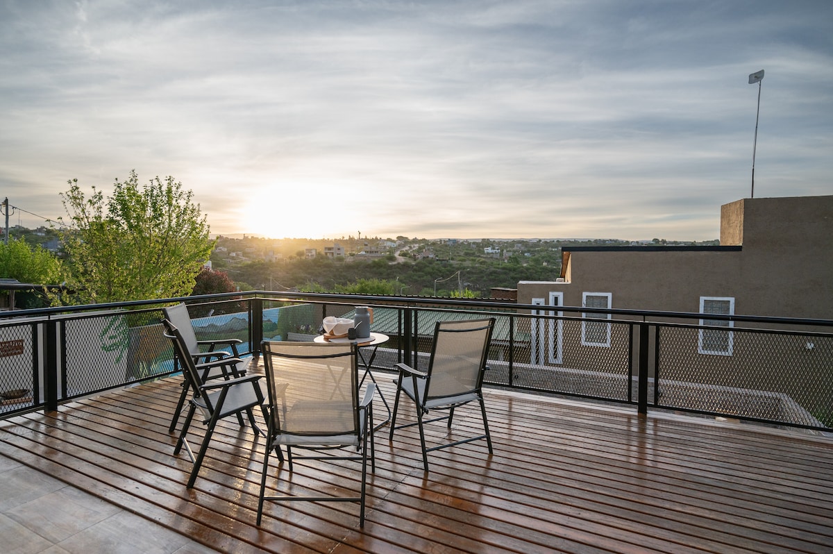 Deux studios rustiques exclusifs avec vue panoramique sur les Sierras et le lac San Roque, pour deux adultes. Equipé de: sommier 2 places, cuisine équipée avec cuisine avec four, réfrigérateur familial, climatisation, ventilateur de plafond, TV avec Directv, wi-fi (en raison de la zone montagneuse, signal wifi faible), terrasse indépendante avec barbecue, piscine avec garages couverts de solarium, linge de maison.