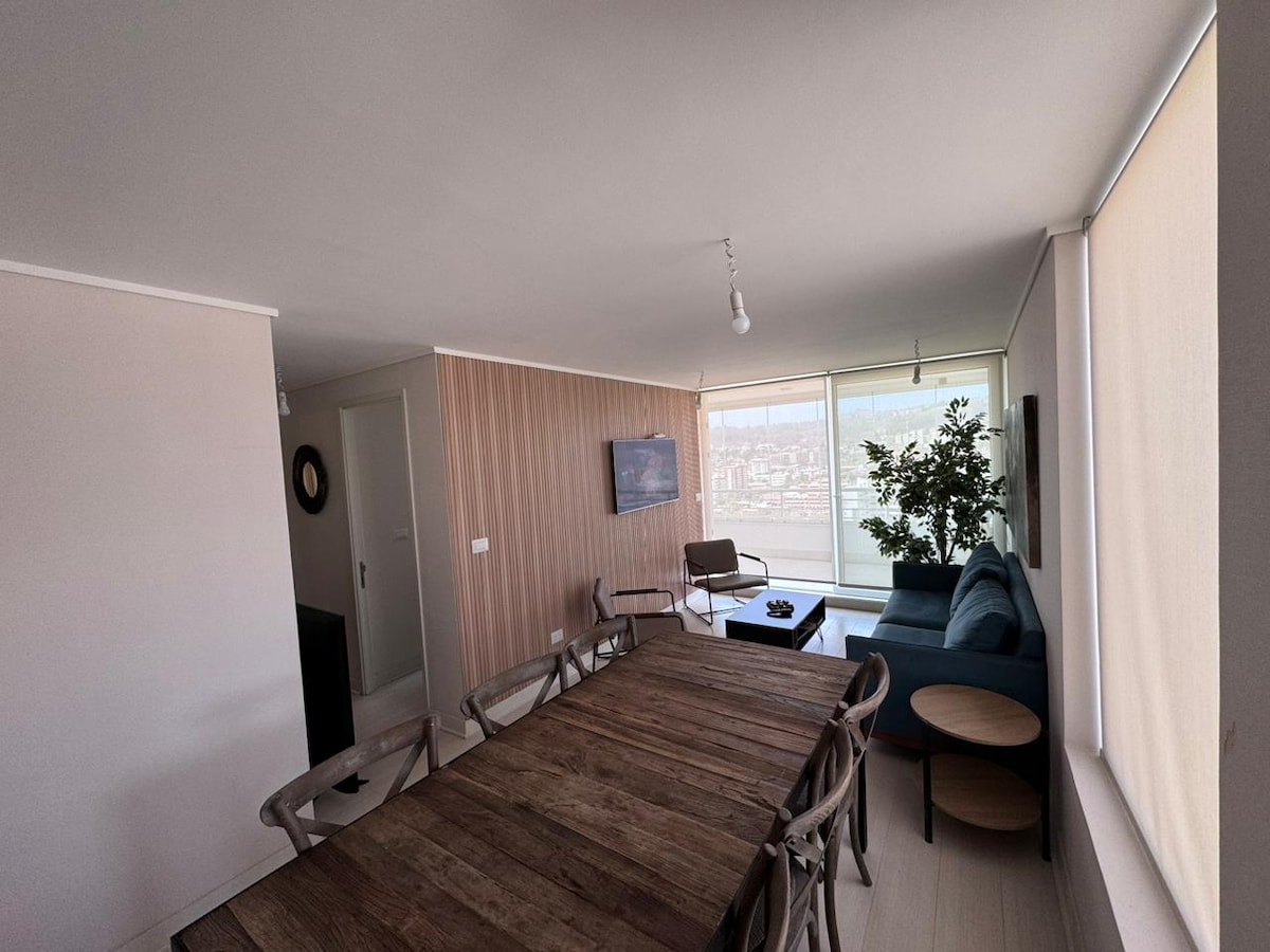 Lindo departamento con terraza vista al mar, un dormitorio un baño, completamente amoblado y equipado. Cuenta con wifi y cable para la tv smart de 42 pulgadas. Excelente iluminación. Edificio cuenta con consejería 24 hrs, 2 piscinas: exterior y temperada, gimnasio, sauna, quincho, lavandería y estacionamiento. Se encuentra cerca de supermercados, bencineras, farmacias. Ubicado a 5 minutos de la playa en auto, y 20 minutos a pie. Se ofrece descuento del 10% a estadías mayores a 7 días.
