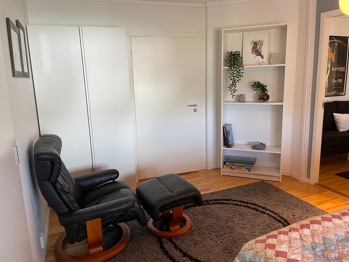 Studio confortable dans un cadre merveilleux pour votre plaisir, à seulement 2 minutes à pied du centre de Nesttun avec ses commerces, ses restaurants et son arrêt de train léger. En 25 min, le train léger vous amène au centre de Bergen, à 18 min de l'aéroport (en voiture, 12-15 min). Un beau jardin avec terrasse et mobilier d'extérieur, poules en liberté et cheminée juste devant votre porte. Parking gratuit à côté de la maison. À proximité : centre commercial Lagunen, musée Edvard Grieg, église Fantoft Stave, parc d'escalade.