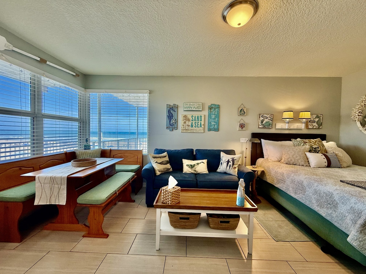 1BR surplombant directement Daytona Beach ! Balcon et salon fenêtre donnant sur la plage et les piscines directement. L'accès direct à la plage se fait par le côté nord du bâtiment où il y a un parking, une rampe et des douches extérieures) La chambre est sur le 3ème fl, 2 gauches de l'ascenseur à la chambre. ** Nouveau départ à midi au lieu de 11 pour votre confort ! 2 lits Queen et canapé-lit, parfait pour un séjour en famille 🏖️☀️🌊