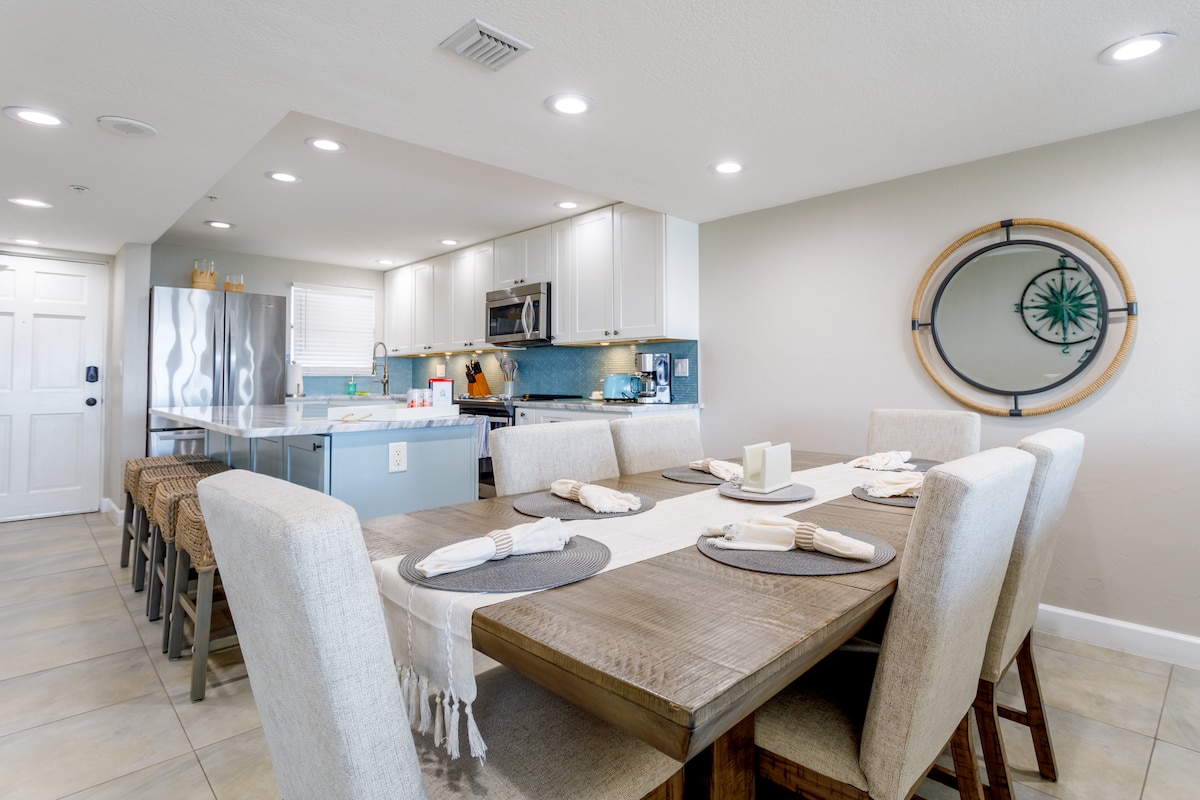Peut accueillir jusqu'à 5 personnes, très lumineux, concept ouvert, rez-de-chaussée, unité avant, à quelques pas de la piscine, cuisine entièrement équipée avec vaisselle, verres, couverts, casseroles, poêles, nouvelle cafetière Keurig, nouveau mixeur, grille-pain, armoire à porcelaine dans la salle à manger, armoires de cuisine, salles de bains rénovées, serviettes de bain fournies, literie pour lit king size dans la chambre principale et 2 lits jumeaux dans la 2e chambre, laveuse/sécheuse dans le logement. Douche à l'italienne, FRAÎCHEMENT PEINT, 2 rouleaux de papier toilette, 1 rouleau de serviettes en papier, (N'oubliez pas que ce n'est pas un hôtel)