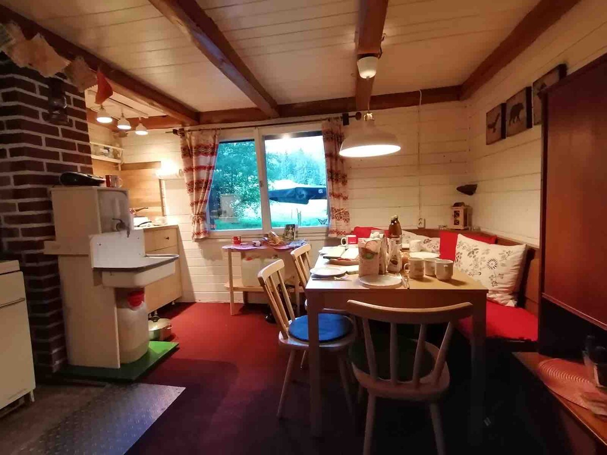Notre petit chalet de montagne simple est situé à la lisière de la forêt, directement à la remontée mécanique Krähenberg et est idéal pour se reposer, faire de la randonnée ou du ski, faire des feux de camp. Dans le salon, il y a un coin repas avec table extensible, kitchenette, canapé, poêle à bois pour le chauffage. Salle de bains et toilettes sont situés dans la maison principale, à environ 50 mètres. Vous y trouverez également suffisamment d'eau. A l'étage il y a un entrepôt de matelas pour 7 personnes. Veuillez apporter des sacs de couchage, des taies d'oreiller et des serviettes.