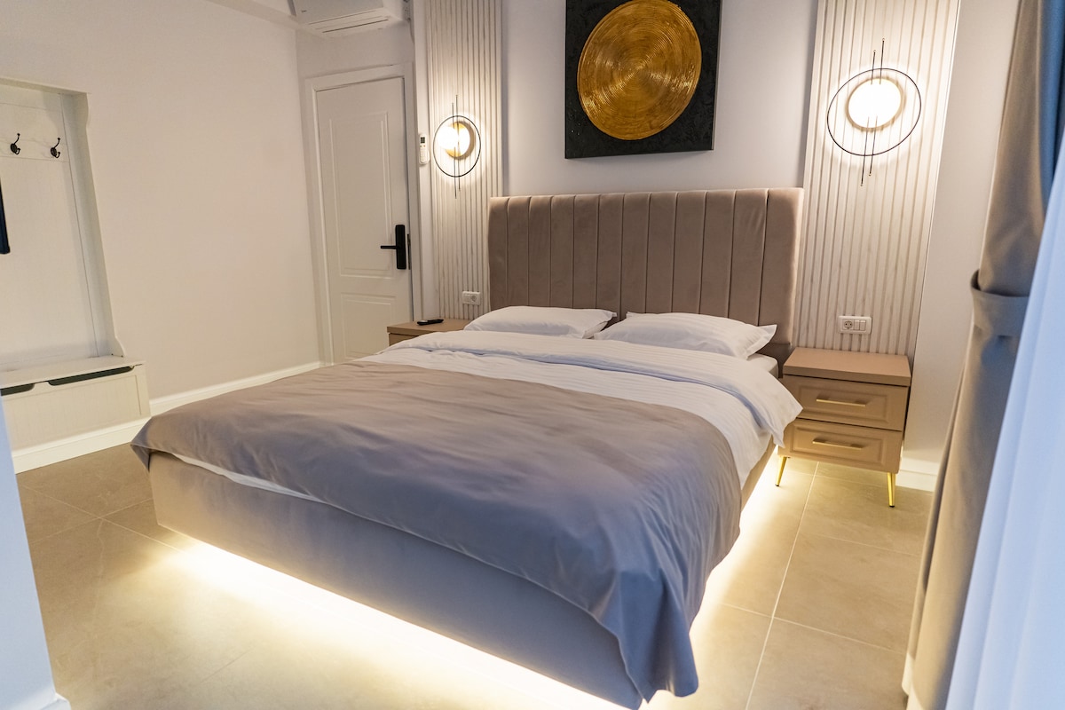 Appartement avec 2 chambres intelligemment cloisonnées,comme suit : cuisine , type d'espace ouvert, chambre , salle de bain, couloir et terrasse généreuse. L'appartement dispose de son propre chauffage, avec chauffage au sol,climatisation, salle d'eau avec douche, télévision connectée et WIFI. La chambre avec un lit queen de 160X200 cm ,équipée d'un matelas haut de gamme, assure un sommeil apaisant. La propre cuisine (espace ouvert) est entièrement équipée(plaque de cuisson à gaz, four électrique, réfrigérateur, lave-linge avec sèche-linge) .