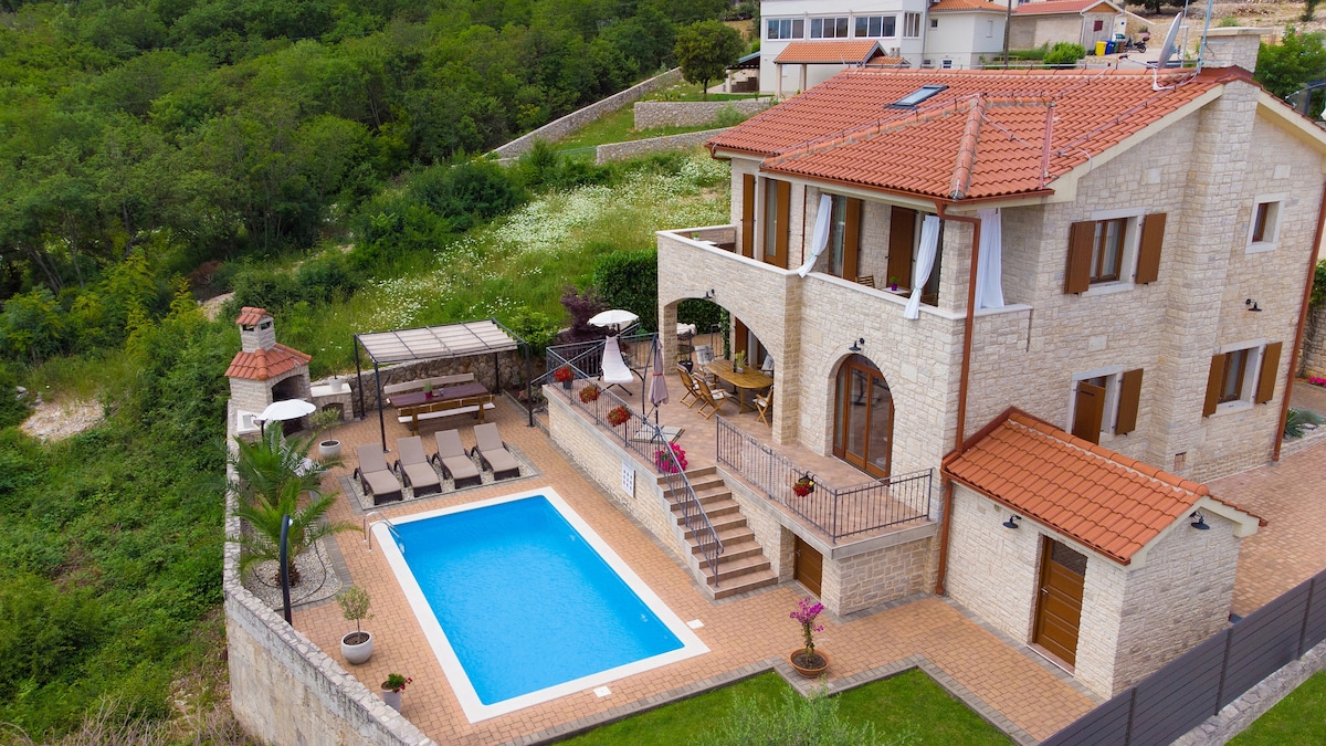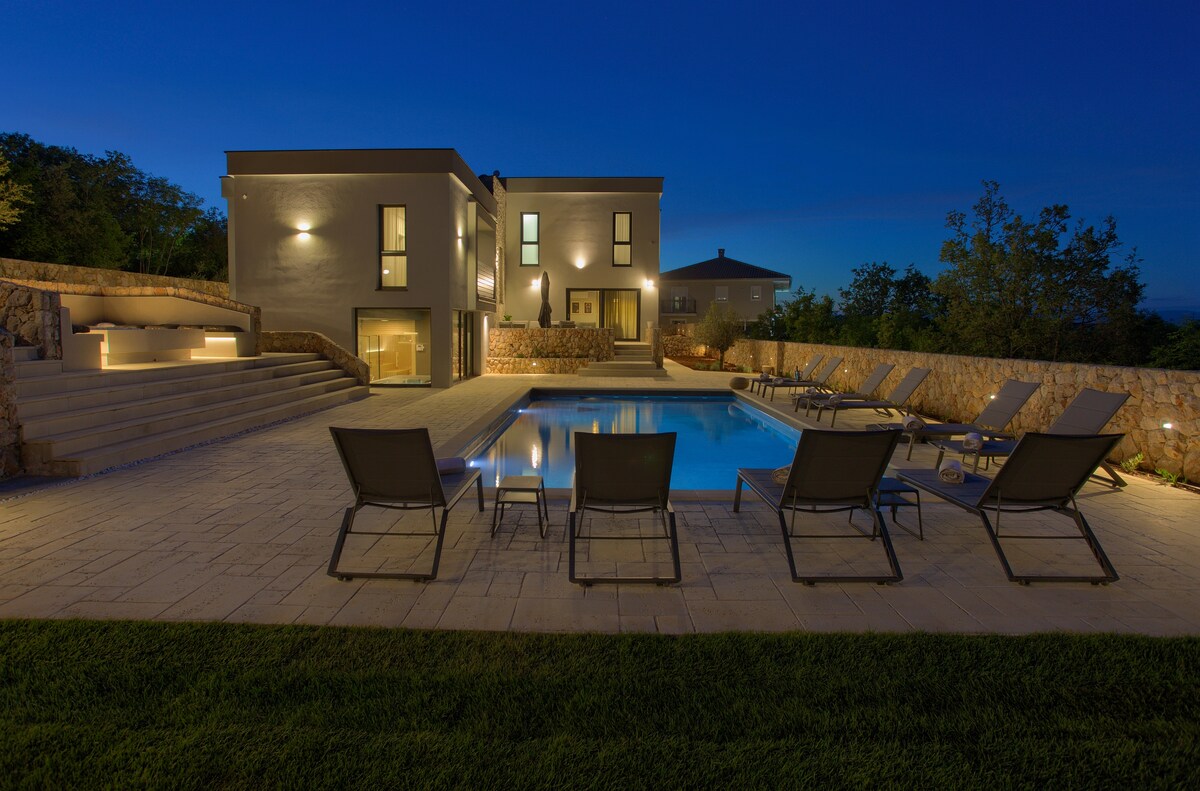 Ce logement unique récemment construit est situé dans le village de Vrh sur l'île de Krk, à 5 km de la vieille ville et de toutes les commodités nécessaires. Il offre l'oasis parfaite pour se reposer et se détendre dans une villa spacieuse équipée de toutes les commodités nécessaires pour des vacances inoubliables. La villa dispose de 6 chambres décorées de manière moderne et peut accueillir 12 personnes. La villa surplombe Velebit, le vert de la forêt, et la mer peut être vue depuis deux chambres. Il est adapté pour un séjour toute l'année car il dispose d'une piscine intérieure, d'un sauna et d'un bain à remous.