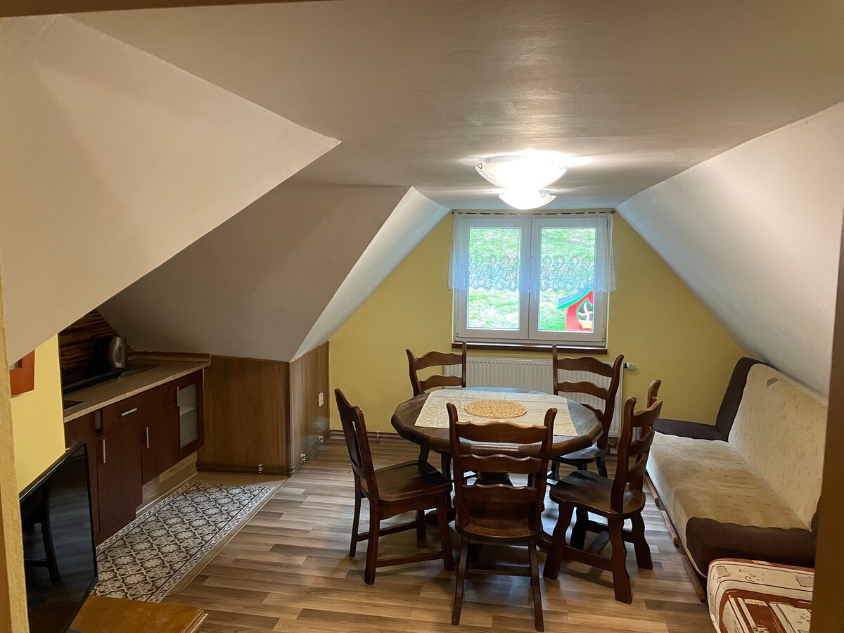 Enjoy a peaceful stay in the Beskydy Mountains with views on the Wallachian hills. This private apartment on the second floor of a family house has its own entrance and terrace. It's an ideal place for a retreat from the hustle and bustle of the city. It's also ideal for adventurers exploring local tourist spots, mountains, ski resorts, cross-country trails, and plenty of fantastic cycling routes (bikes and gear can be stored in the garage). Everything is within easy reach.