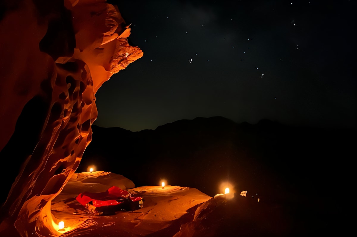 Notre expérience de sommeil sous les étoiles est nichée au milieu du désert de rhum de wadi en toile de fond de superbes falaises rouges, adhérant au principe traditionnel et nomade. L'expérience de camping a été soigneusement aménagée avec tout le nécessaire pour les nuits. Trouvez la solitude et la paix en marchant comme un canyon et en admirant les couchers de soleil comme vous ne l'avez jamais vu. Les étoiles abondent dans le ciel nocturne et vous pouvez voir la Voie lactée avec vos yeux nus, surtout après minuit, une expérience de vie rare.
