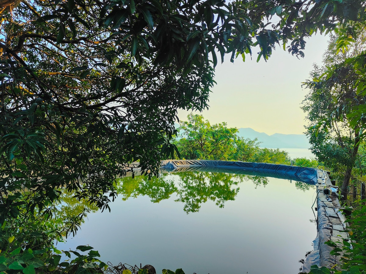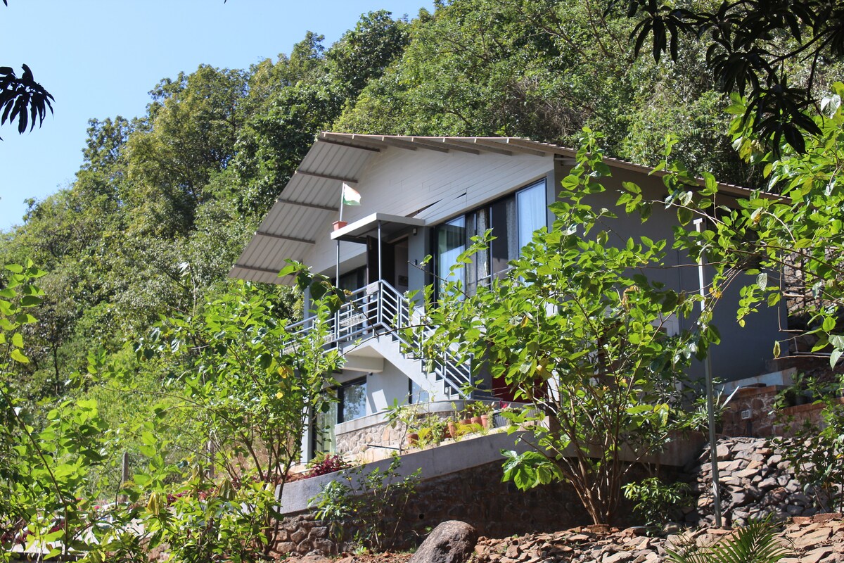 Ce luxueux chalet de suite (l'un des 2 cottages de la propriété) offre la vue la plus directe sur le lac Mulshi est construit à partir de boue naturelle et de pierre de latérite. Le lac mulshi est visible à travers la grande fenêtre en verre directement en face du lit en bois vintage. Le chalet est situé loin de nos espaces communs à 2 à 3 minutes à pied et comprend des marches de navigation le long d'une pente. Notre propriété est répartie sur 2 acres de verdure, d'arbres indigènes, de vergers et de fermes dans le Sahyadris entre Mumbai et Pune.