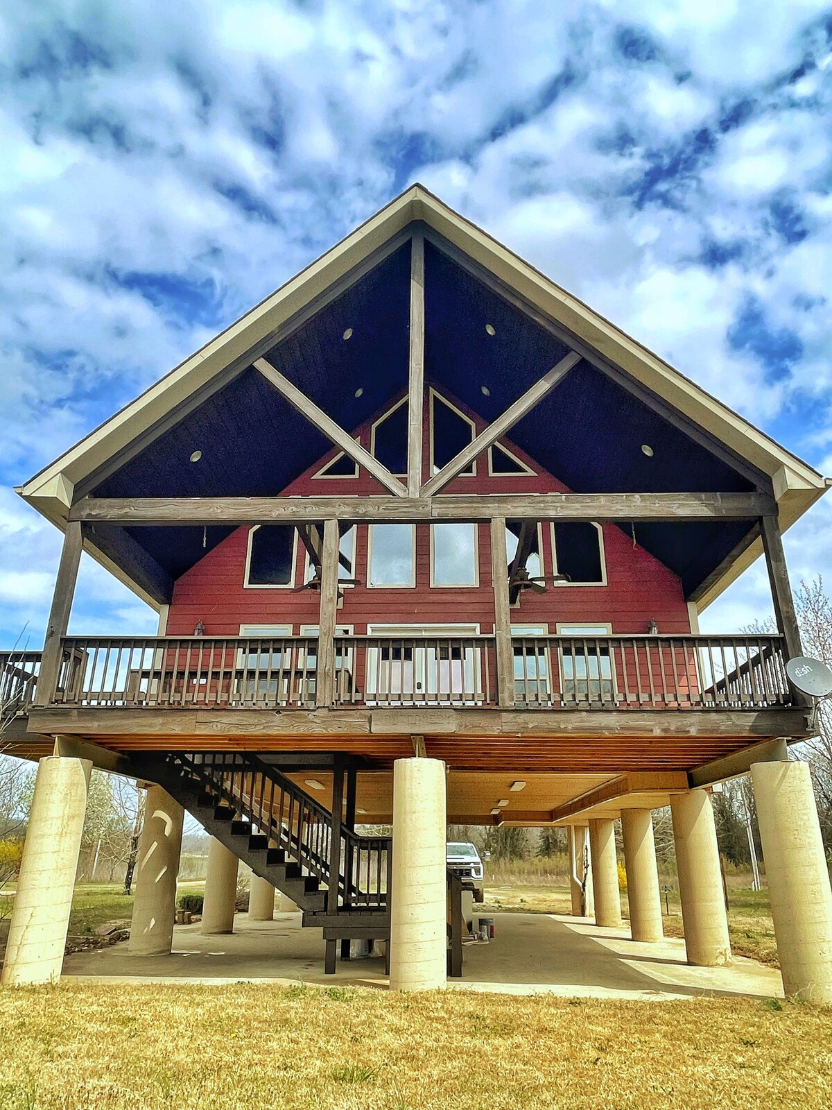 Il s'agit de notre cabane familiale. Notre famille cultive du soja, du riz et du maïs. Nous sommes trop occupés à travailler au printemps, en été et une partie de l'automne pour profiter de notre cabane. Nous voulons partager notre bel endroit pour que les autres puissent en profiter. Il est situé à environ 10 minutes de Poplar Bluff, MO. Nous habitons à environ 30 minutes, donc nous pouvons être disponibles en cas de besoin. Nous avons la télévision par satellite et une connexion Wi-Fi. Le chalet est assez isolé, niché parmi les arbres avec la rivière Black s'écoulant à moins de 100 pieds de la terrasse.