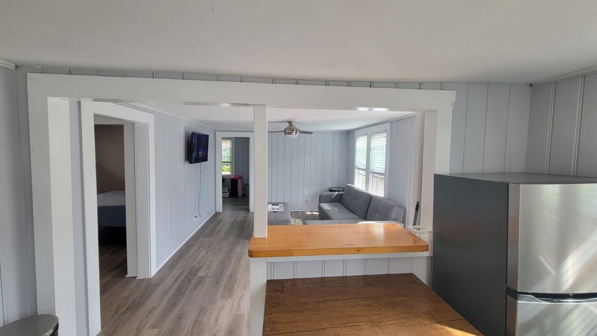 Cottage simple mais confortable sur une propriété d'un acre à côté de la maison principale. Chambre et salon de taille moyenne. Petite cuisine et salle de bain. La cuisine est entièrement équipée pour cuisiner. La climatisation est une unité portable et seulement dans la chambre. Jeux, livres et puzzles fournis. Il n'y a pas de câble, mais une télévision connectée est incluse avec accès à Netflix, etc. si vous avez un compte. L'espace extérieur comprend un barbecue au charbon de bois et des sièges. Grande cour arrière avec jeux de cour, panier de basket et foyer.