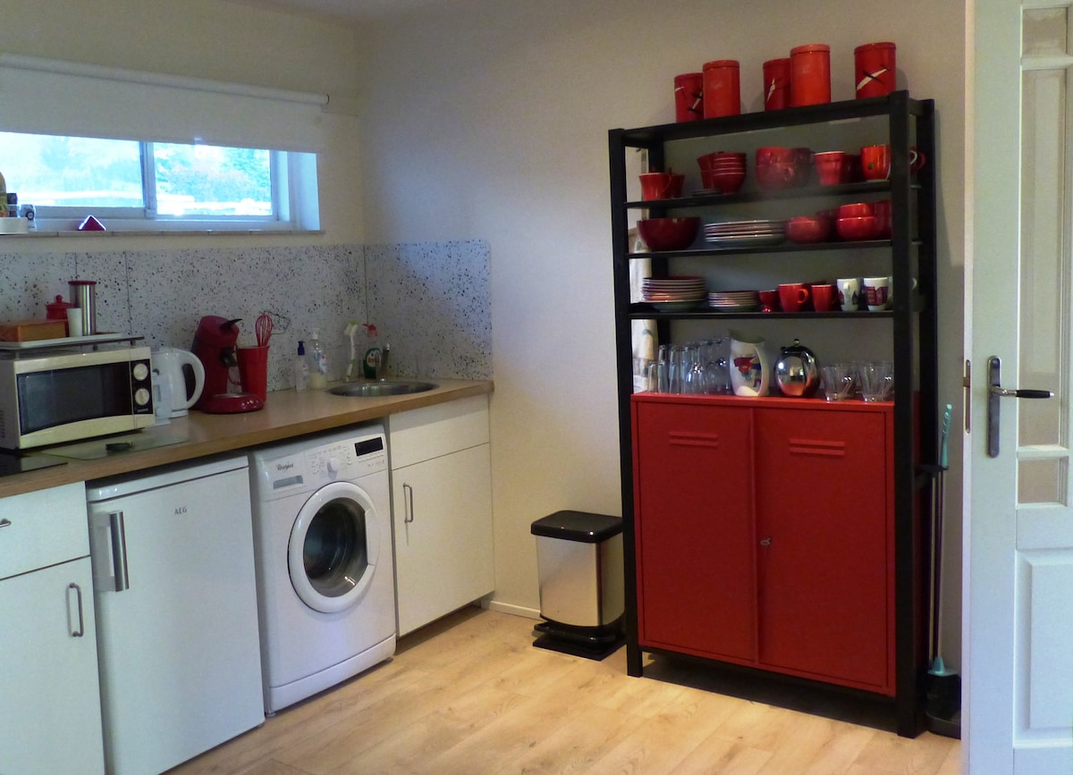 Détendez-vous dans un quartier calme, près de la ville hanséatique de Zutphen. Le chalet indépendant est situé sur la propriété d'une ferme. Au rez-de-chaussée, il y a un salon spacieux avec cuisine ouverte (îlot de cuisine) avec lave-vaisselle, plaque à induction, réfrigérateur et micro-ondes combiné. Également au rez-de-chaussée, il y a une chambre avec un lit double et une salle de bains spacieuse avec douche à l'italienne, lavabo double et toilettes. Au 1er étage se trouve un loft (connexion ouverte) avec un lit double.