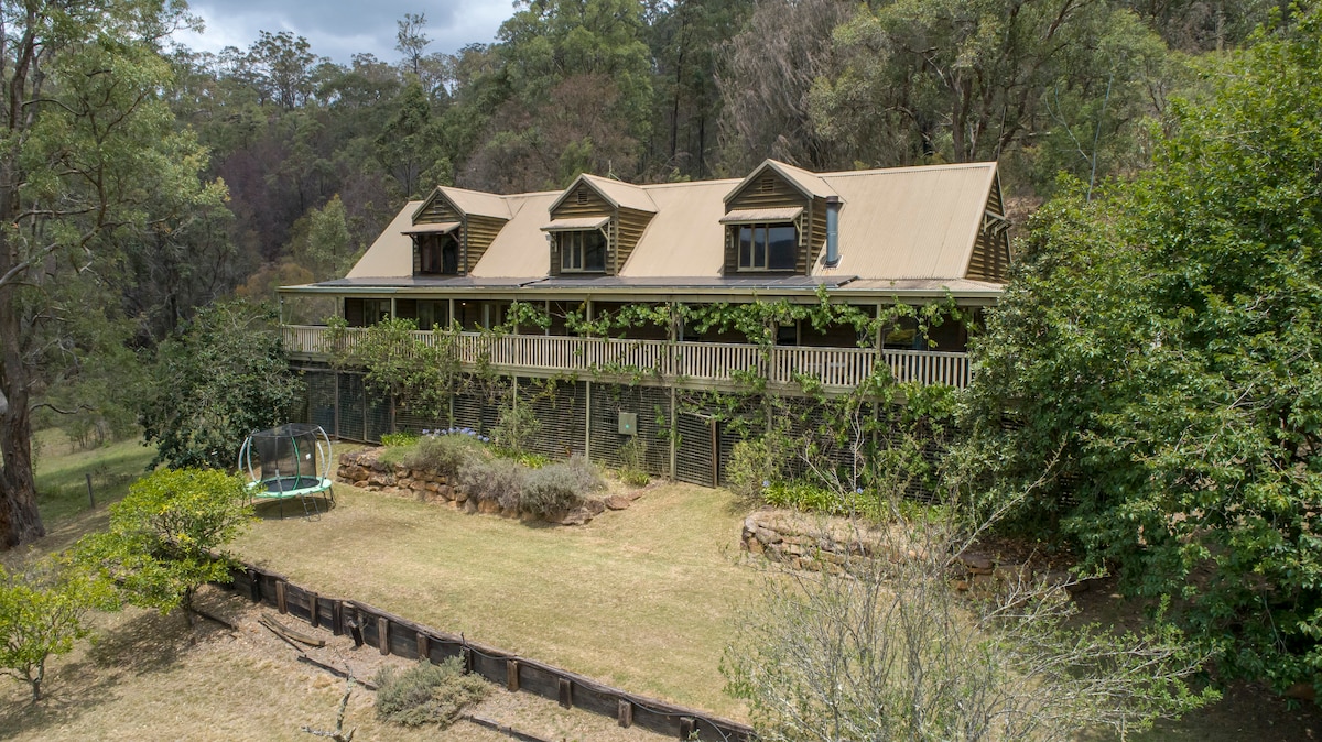 Profitez de cette ferme sereine sur 12 acres en couple ou en lieu de rencontre entre amis. Spacieux, confortable avec tous les besoins satisfaits. Superbe vue ouverte située à côté d'un petit ruisseau. Paradis avec des acres pour explorer la faune, les vélos, le trampoline, les cubby, les équipements sportifs, les jeux de société, le wifi et les DVD. Détendez-vous au bord de la cheminée ou sur l'un des six bancs du parc pendant la journée, ou écoutez votre musique sur le système audio extérieur qui fait écho à votre vallée cachée.