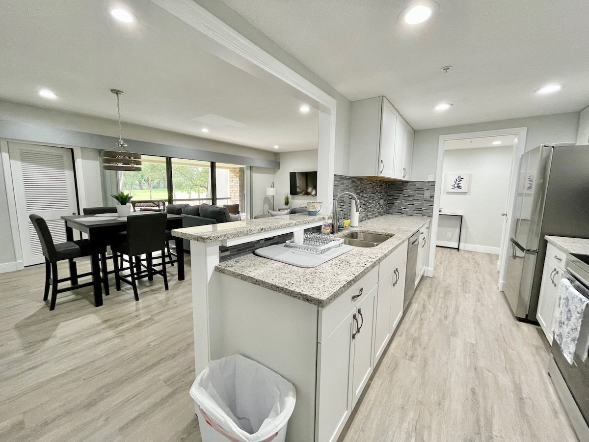 Détendez-vous dans ce grand studio entièrement rénové, dans le COMPLEXE de golf et de tennis SADDLEBROOK. Le sudio dispose d'une belle terrasse juste sur le lac avec une VUE IMPRENABLE sur le lac et le vert du golf. Pour votre confort, un lit Queen avec matelas neuf, une kitchenette de bonne taille avec: réfrigérateur, micro-ondes, grand grille-pain, cafetière et évier. Le studio dispose également d'un coin repas, d'un espace de travail et d'un dressing, ainsi que d'une connexion Wi-Fi et d'une télévision par câble. Dans les restaurants locaux du complexe hôtelier et pub.
