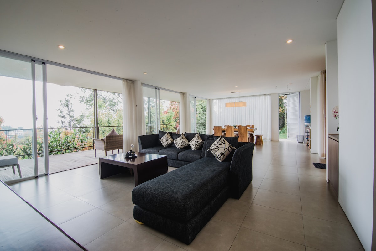 Our villa is located at the peak of prestigious North Bandung overlooking Bandung City. It is adjacent to the refreshing THR Djuanda, yet close to the best culinary area in Dago Pakar. It is a perfect place to unwind from daily routines, but not far from the commercial area of Dago Street. Our villa has exotic architectural character with a challenging "flying villa" construction concept. It was constructed in "down slope" land where the main building is lower than the entrance and carpark.