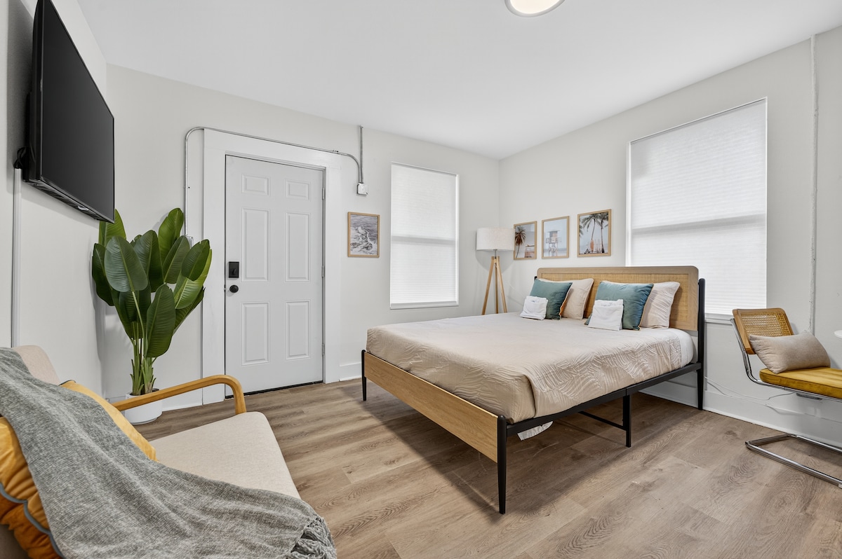 Vous allez adorer le style et la commodité de cet appartement studio avec kitchenette et salle de bain complète situé au cœur du centre-ville, juste à côté de Palafox St et Garden St. C'est l'endroit idéal pour séjourner au centre-ville après un spectacle au Vinyl Music Hall ou une nuit de danse au Seville Quarter. Confortable et bien aménagé pour des séjours longue durée ! Marchez jusqu'à toutes les destinations du centre-ville. Parking 12 $ par jour au garage Jefferson St. 1 lit King/1 lit Queen, capacité d'hébergement de 4 personnes. **Pas d'accès au balcon Palafox depuis ce logement.**