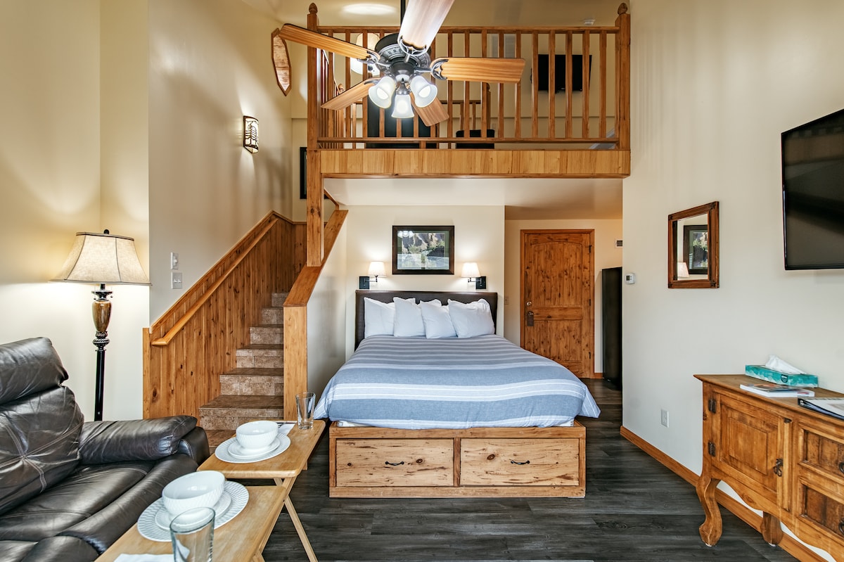 Situé juste à la frontière de Yellowstone Park, un petit studio confortable au 3e étage nouveau lit KING size, avec cuisine, ustensiles de cuisine/vaisselle, draps, douche en pierre, shampoing/après-shampooing, serviettes, coin repas, balcon extérieur donnant sur les montagnes, Main Street USA, animaux sauvages qui passent et traînent dans la cour avant avec un feu de camp et un porche couvert au 1er étage.