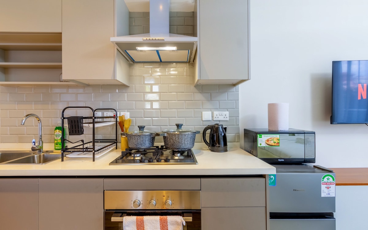 Profitez d'un logement élégant et central. ÉQUIPEMENTS HAUT DE GAMME Climatisation Friteuse à air/cuisine entièrement équipée Lavage gratuit des vêtements sur place Moustiquaires sur porte/fenêtre Connexion Internet rapide haut de gamme (60 Mbit/s) Netflix Table basse/bureau avec plateau relevable (travail sur le canapé) Purificateur d'eau pour une eau propre ÉQUIPEMENTS DE L'IMMEUBLE Emplacement central Parking dédié Salle de sport, sauna et hammam Salle de jeux avec squash, billard Piscine à débordement Restaurant dans l'immeuble Épicerie dans le bâtiment Excellente pression d'eau