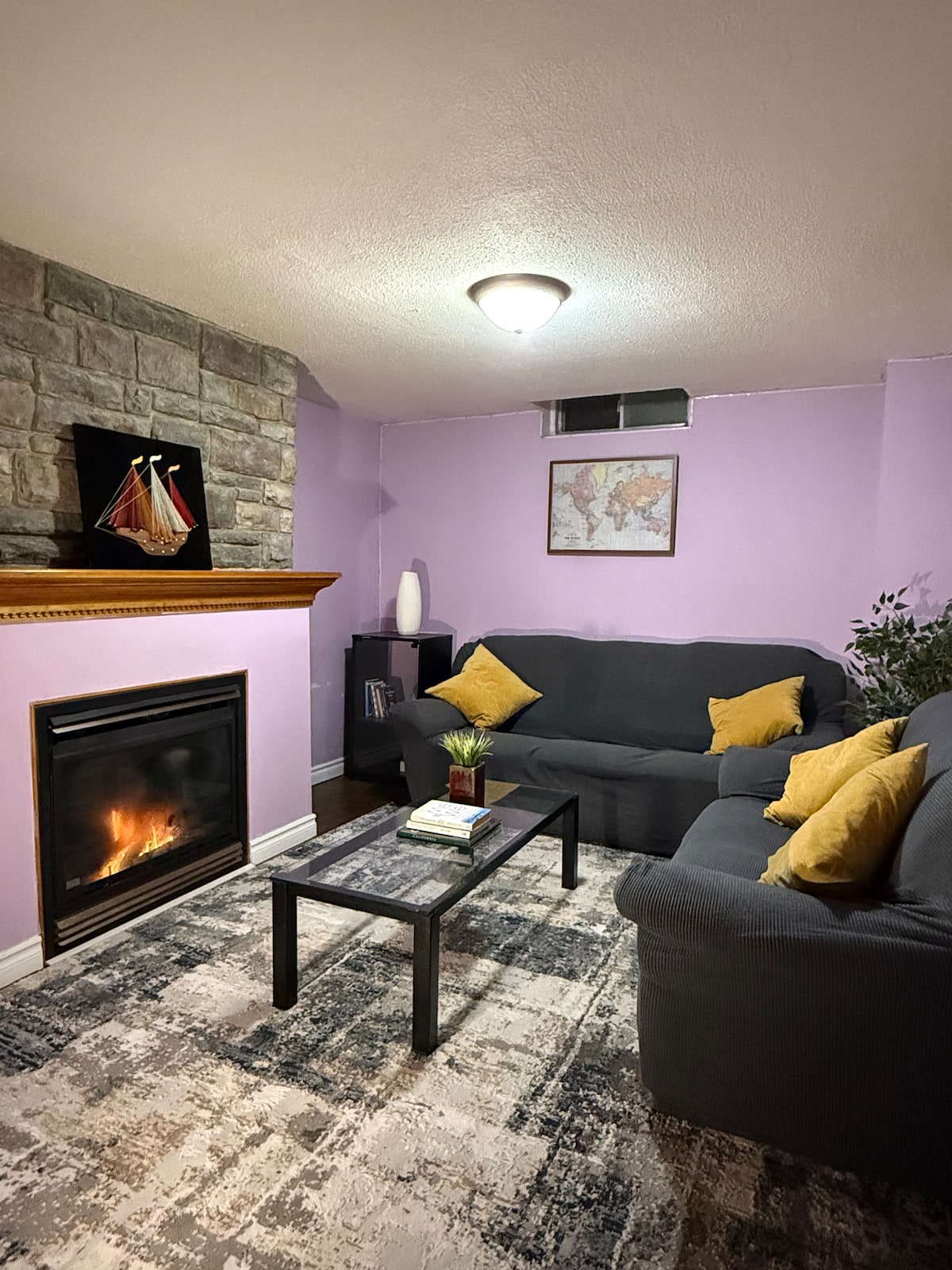 Legal Basement - Cet endroit chic peut accueillir confortablement jusqu'à 5 personnes et est entièrement meublé. Il y a 2 chambres, chacune pouvant accueillir 2 personnes, ainsi qu'un lit de jour dans le séjour pour la 5e personne. Une chambre dispose d'un lit Queen Size, tandis que l'autre dispose d'un lit double. En outre, il y a 2 tables d'étude avec des chaises, une dans chaque chambre et une dans le séjour. La cuisine méticuleusement conçue présente des touches modernes et luxueuses. La salle de bain élégante dispose d'une douche.