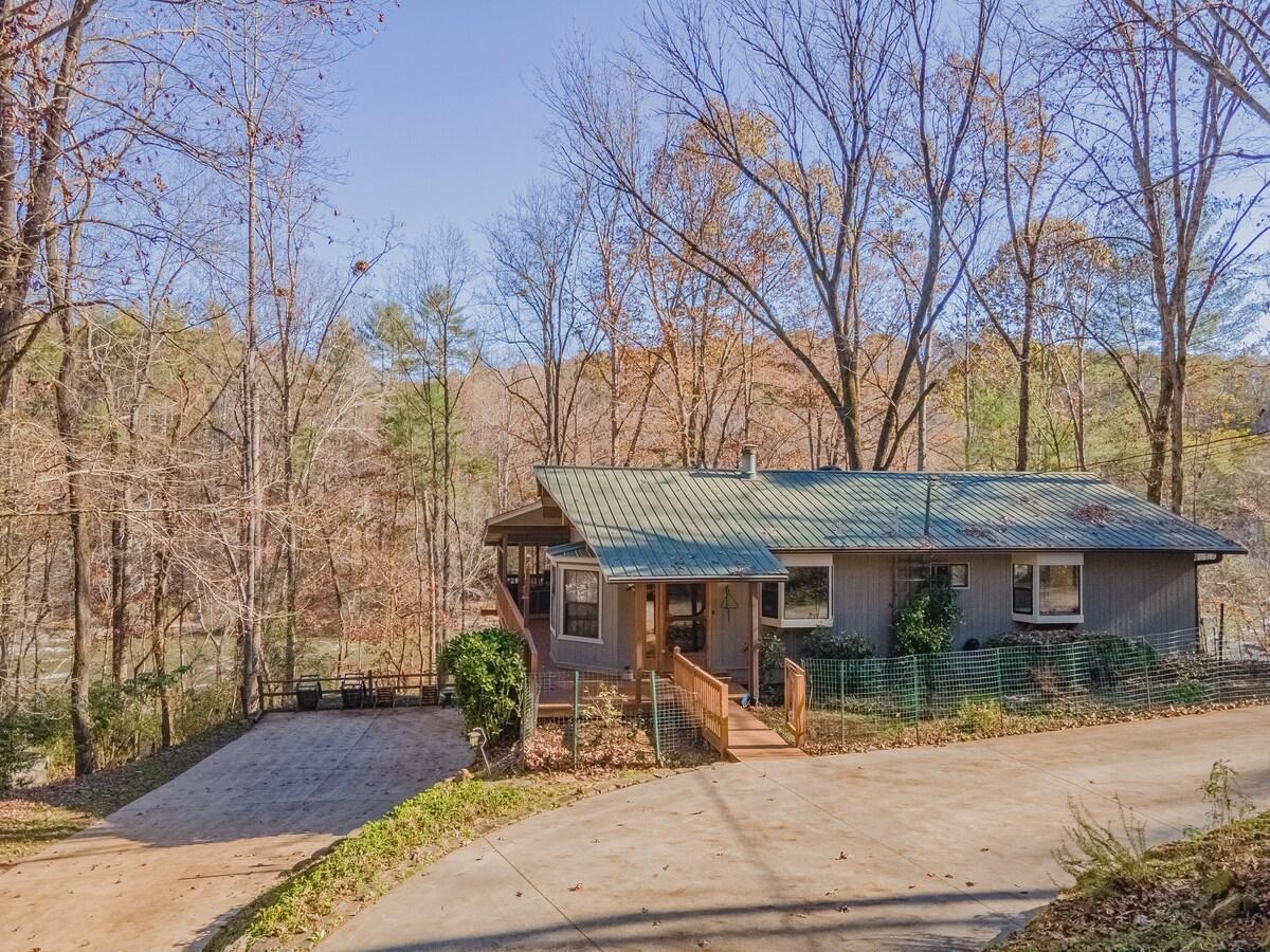 Grand porche grillagé, vue sur la rivière et promenade facile jusqu'au bord de l'eau !! Capacité d'accueil de 10 à 14 personnes ! Emmenez toute la famille (ou 2 familles) et venez vous détendre sur près de 3 acres à River Dusk, avec vue sur les rives de la magnifique rivière Chattahoochee ! Réveillez-vous et profitez de votre petit-déjeuner sur notre grand porche grillagé avec des sièges pour toute la famille. Écoutez les sons apaisants des rapides et saluez les kayakistes/tubers/rafts qui passent en aval.