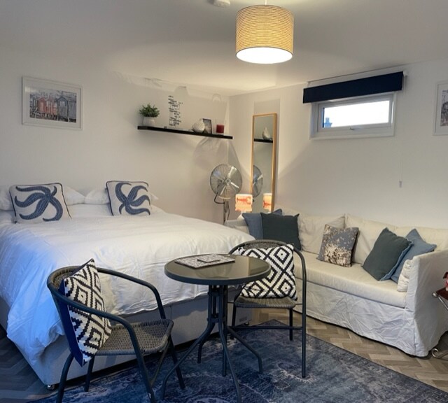 Belle partie indépendante du bungalow, impeccablement propre – chambre double avec salle de douche attenante. Cuisine/coin salon avec réfrigérateur/congélateur, micro-ondes/gril - porte patio donnant sur un jardin privé orienté sud. Canapé-lit double. Parking hors rue avec portail vers votre espace extérieur. INCLUS DANS VOTRE SÉJOUR - Cadeaux de bienvenue - contenant généralement du lait frais, du jus de petit-déjeuner, du pain, du beurre, des fruits frais, du thé, du café et surtout du Prosecco !