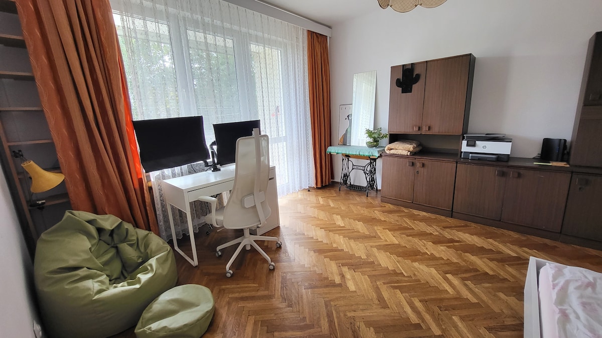 Cette fois, c'est le couple de voyageurs qui vous propose son logement. Nous vous invitons dans un appartement privé unique dans notre maison! Nous vous proposons deux chambres spacieuses équipées de meubles historiques, un jardin unique avec un espace pour le barbecue et deux places de stationnement gratuites. À distance de marche d'Aqua Park, à seulement 2 minutes, de Multikino et Serenada avec des magasins et des restaurants, à 3 minutes! À 15 minutes en bus du centre. On propose des balades en voitures classiques : Datsun 280Z, 500 SL, Coupé quattro, MX-5.