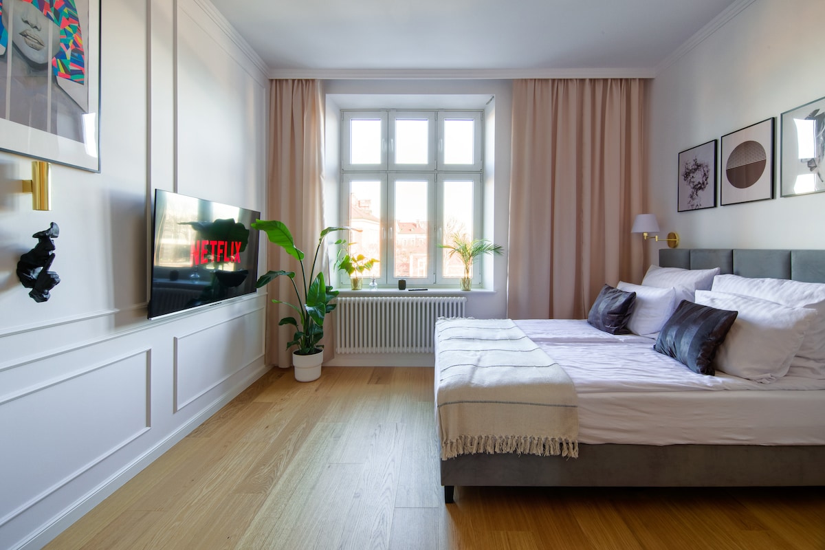 Parfait pour les voyageurs et les nomades numériques à la recherche d'un confort ultime : - 5 min à pied de Main Sq. et Kazimierz - Parking privé gratuit sur place - Bruit bloquant les fenêtres du sol au plafond avec stores - Climatisation calme - Purificateur d'air avec filtre HEPA - Eau du robinet filtrée et adoucie - Grand lit avec matelas thermoélastique - Télévision connectée - WIFI 300 Mo - Banque, bureau de change et distributeur automatique de billets à l'intérieur du bâtiment - Café, dépanneur, boulangerie, plusieurs restaurants et marché aux légumes à 1 min