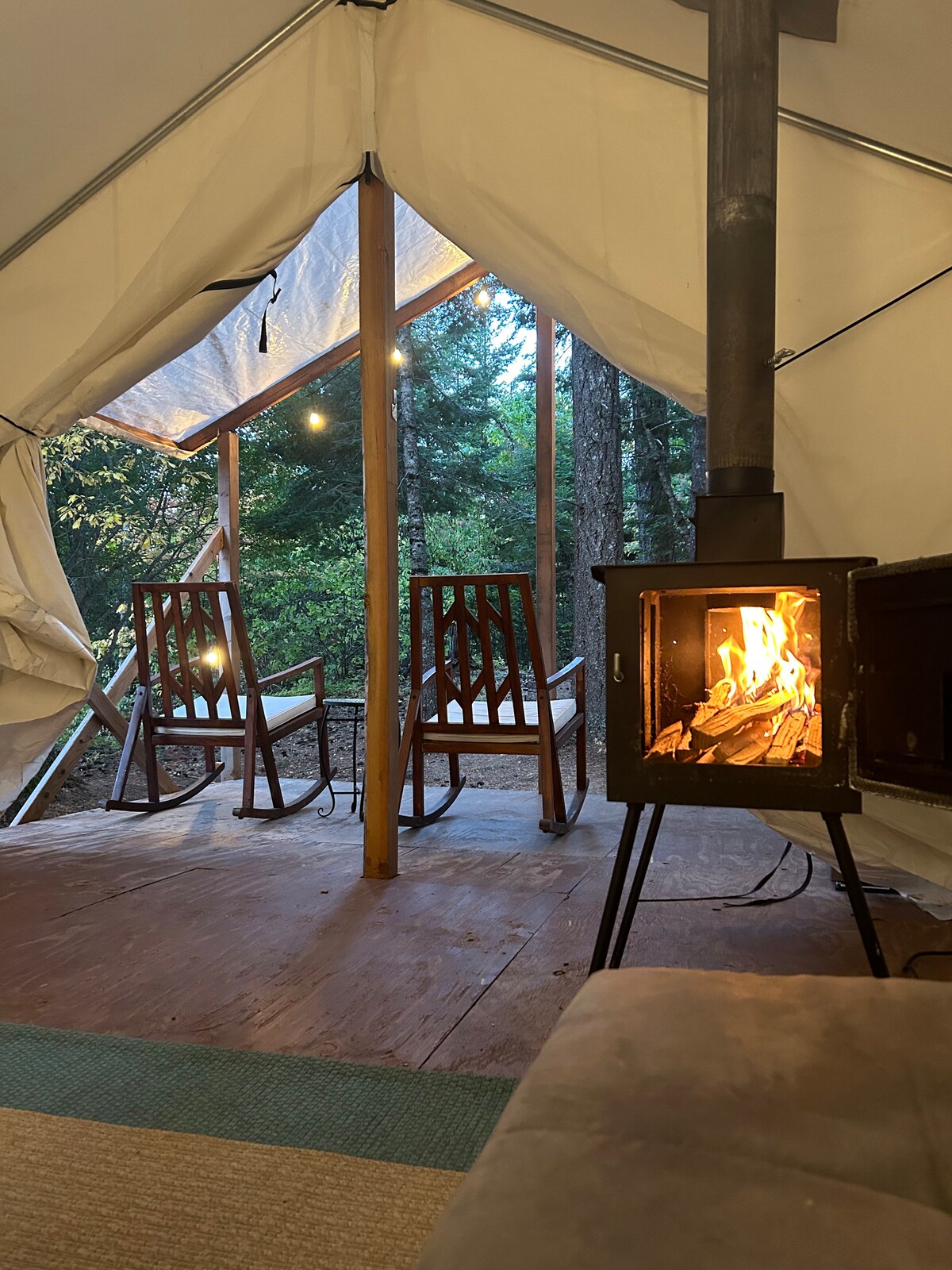 Nos tentes de glamping entièrement meublées sont nichées le long du ruisseau et conçues pour un séjour paisible et réparateur. À l'intérieur, chaque tente est équipée d'un lit queen en mousse à mémoire de forme, d'un poêle à bois, d'un évier à pompe privé, d'une cuisinette, de lanternes à piles et de stations de recharge. À l'extérieur, vous avez votre propre foyer, deux chaises Adirondack et une grande glacière. Tout ce qu'il faut pour vous détendre, vous ressourcer et vous sentir comme chez vous dans la nature. C'est la simplicité du camping, avec le confort et le style d'une retraite de charme.